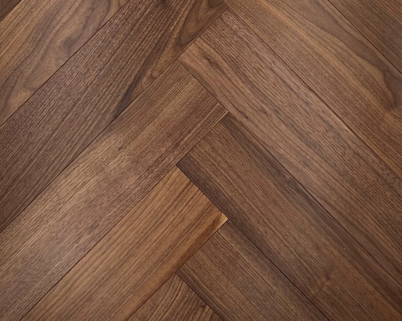 Engineered American walnut herringbone parquet 90º is available in the following width: 125 mm, length: 600 mm, with an overall thickness of 14 mm ( 3 mm top walnut layer ). Rustic Grade. Suitable for underfloor heating.