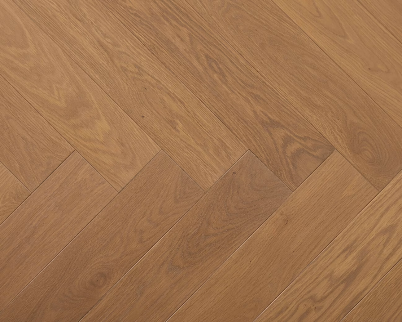 Engineered Oak herringbone 90º style, made from European Oak (Quercus petraea ) and available in the following width(s): 70/90/120 mm, following length(s): 350/500/600 mm with overall thickness 15 mm ( 4 mm top oak layer ) / 20 mm ( 6 mm top oak layer ) options and following grade(s): Prime, Nature and Character. The base layer is made from WBP European Birch cross-layer plywood. Suitable for underfloor heating