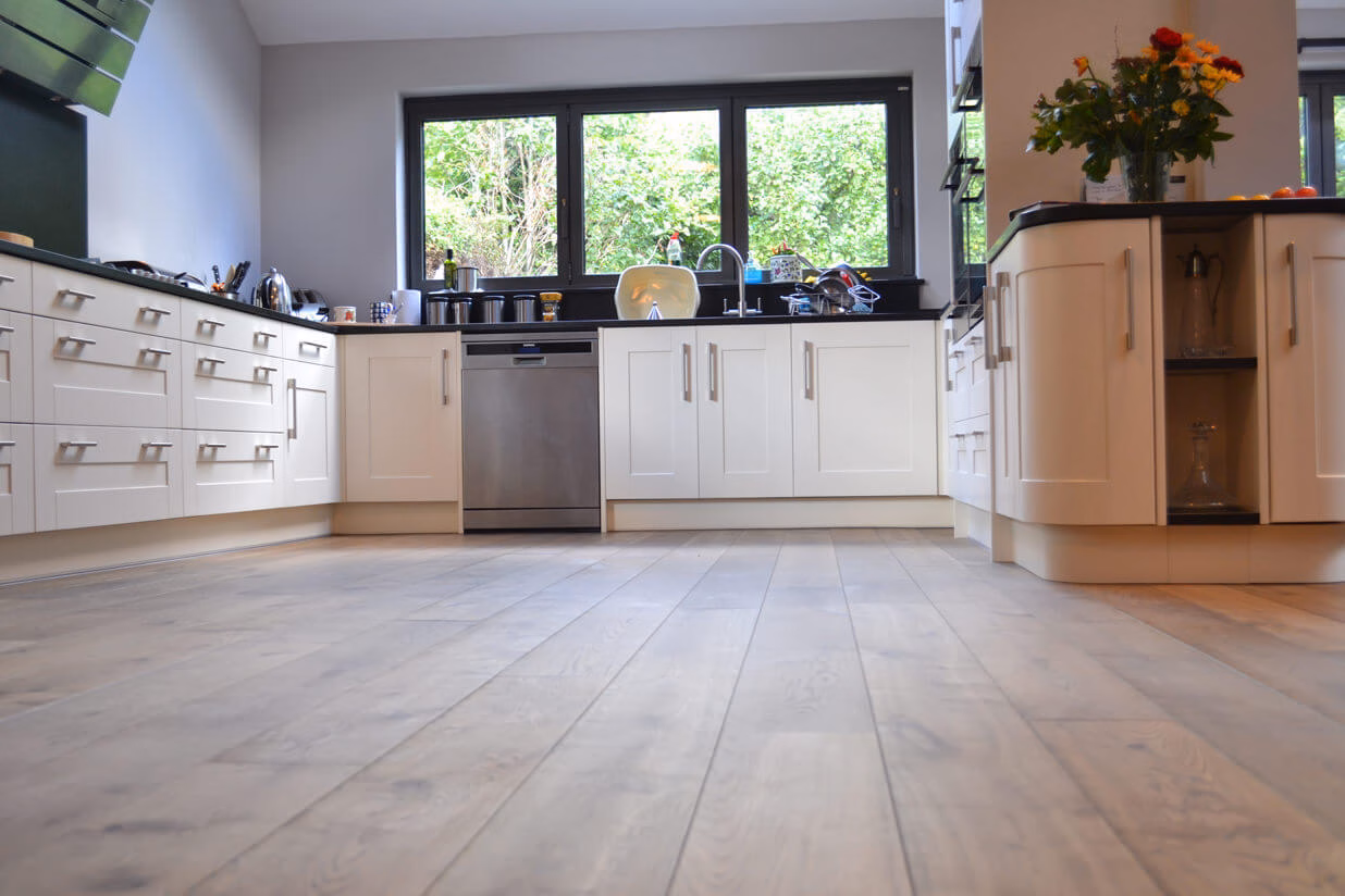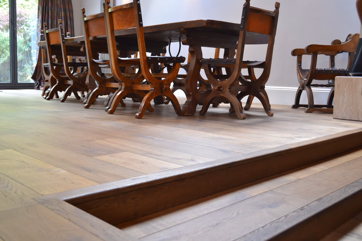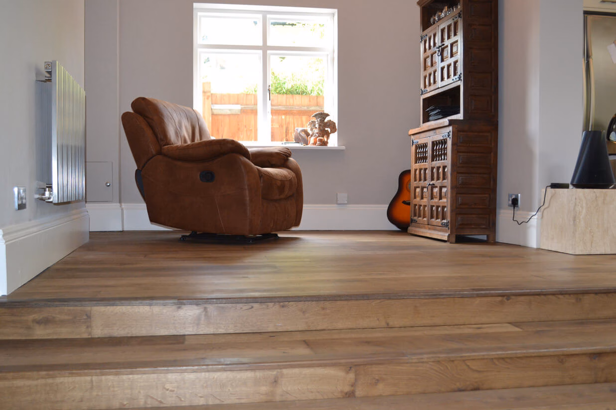 The wood floors in Ealing were supplied with 15 mm x 180mm wide engineered oak planks. The wood was graded Character grade, with standard lengths of 2.4m being the average. The 16mm thickness comprises a 4mm top layer of European oak and 15mm quality birch plywood.