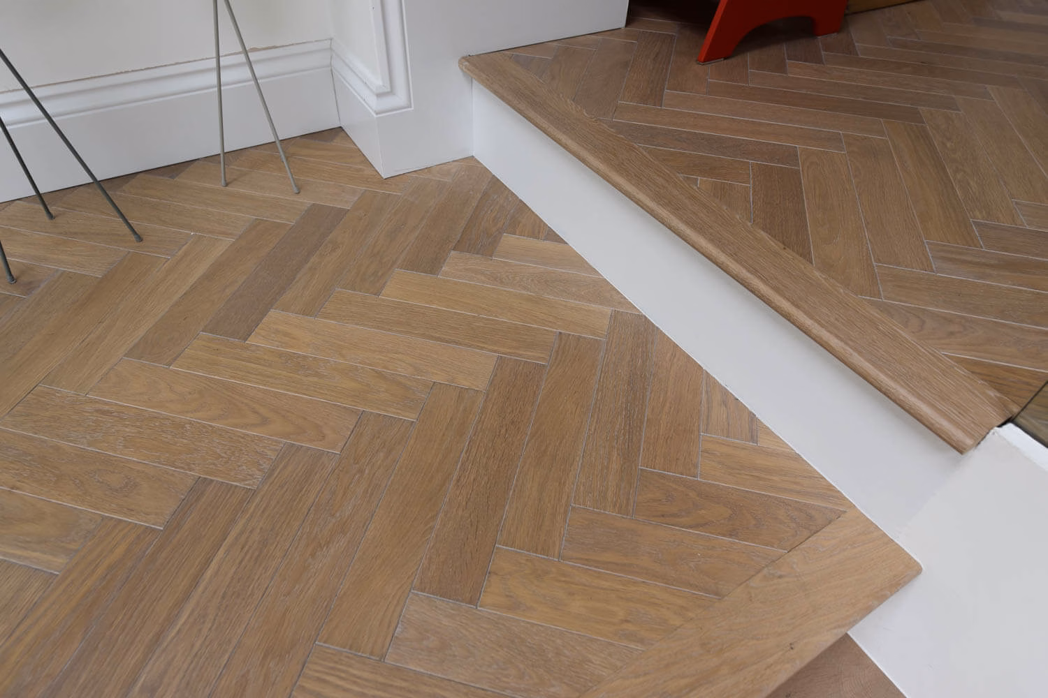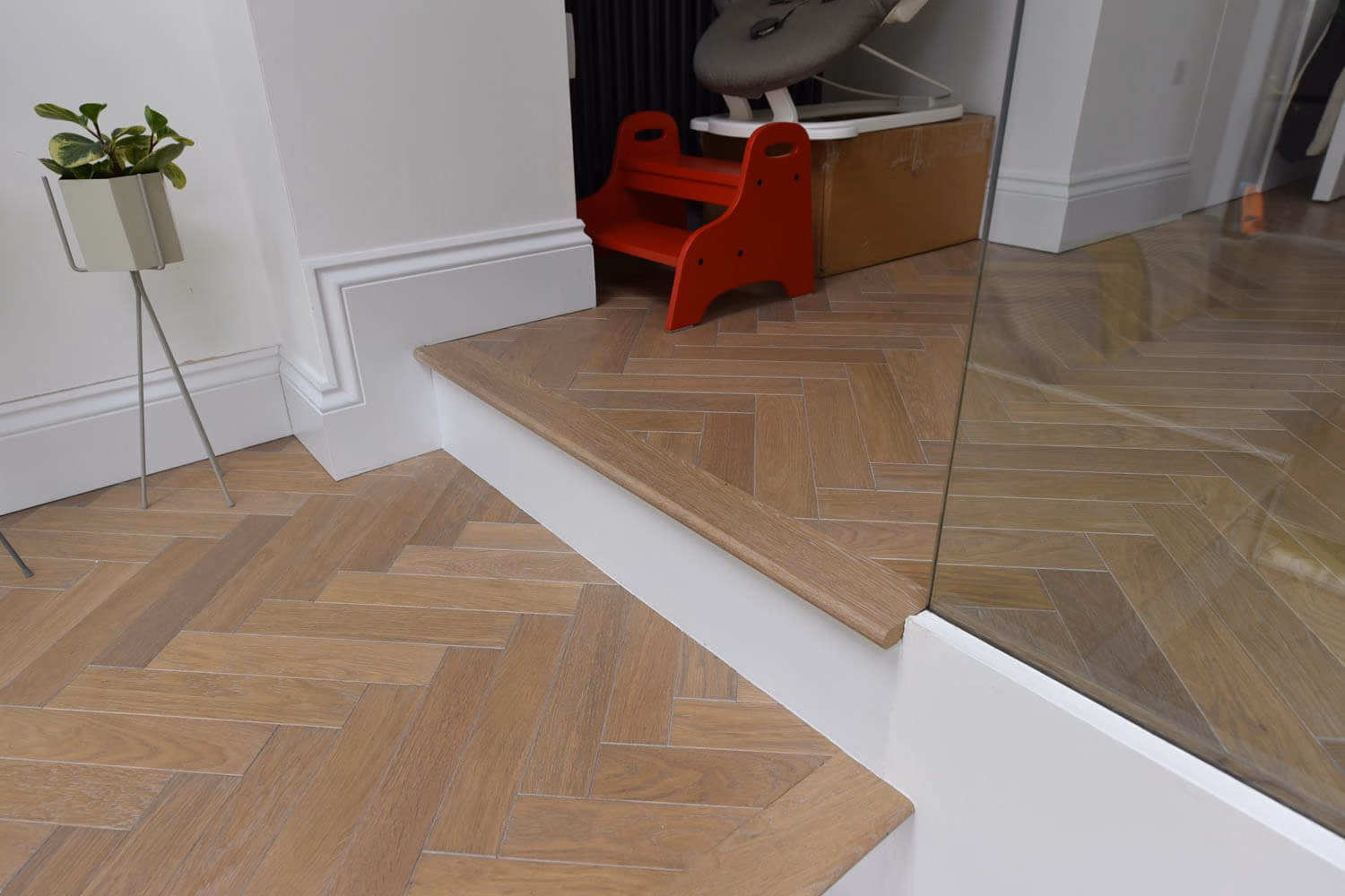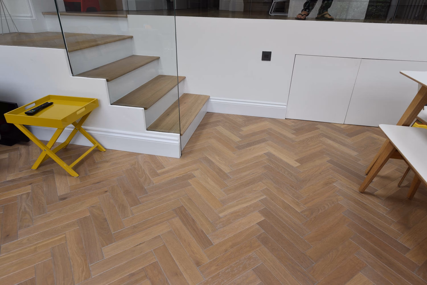 The idea for this project in Ealing, London W13 was to use a small parquet block in keeping with the age of the Victorian property and yet have a contemporary look that would work well with the white kitchen and furniture. The variation of light greys and subtle brown tones works really well against the glass balustrade and the bullnose seamless treads.