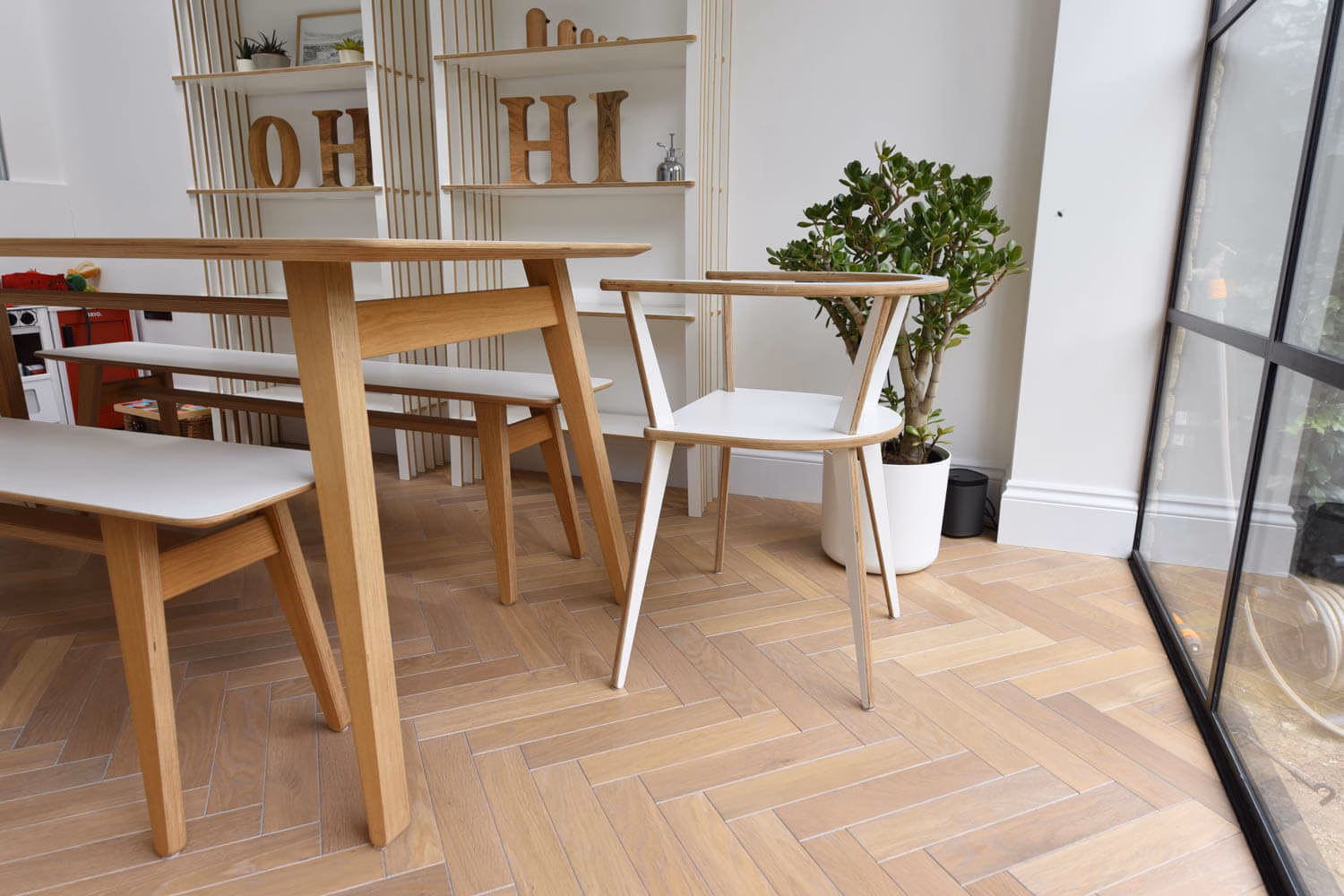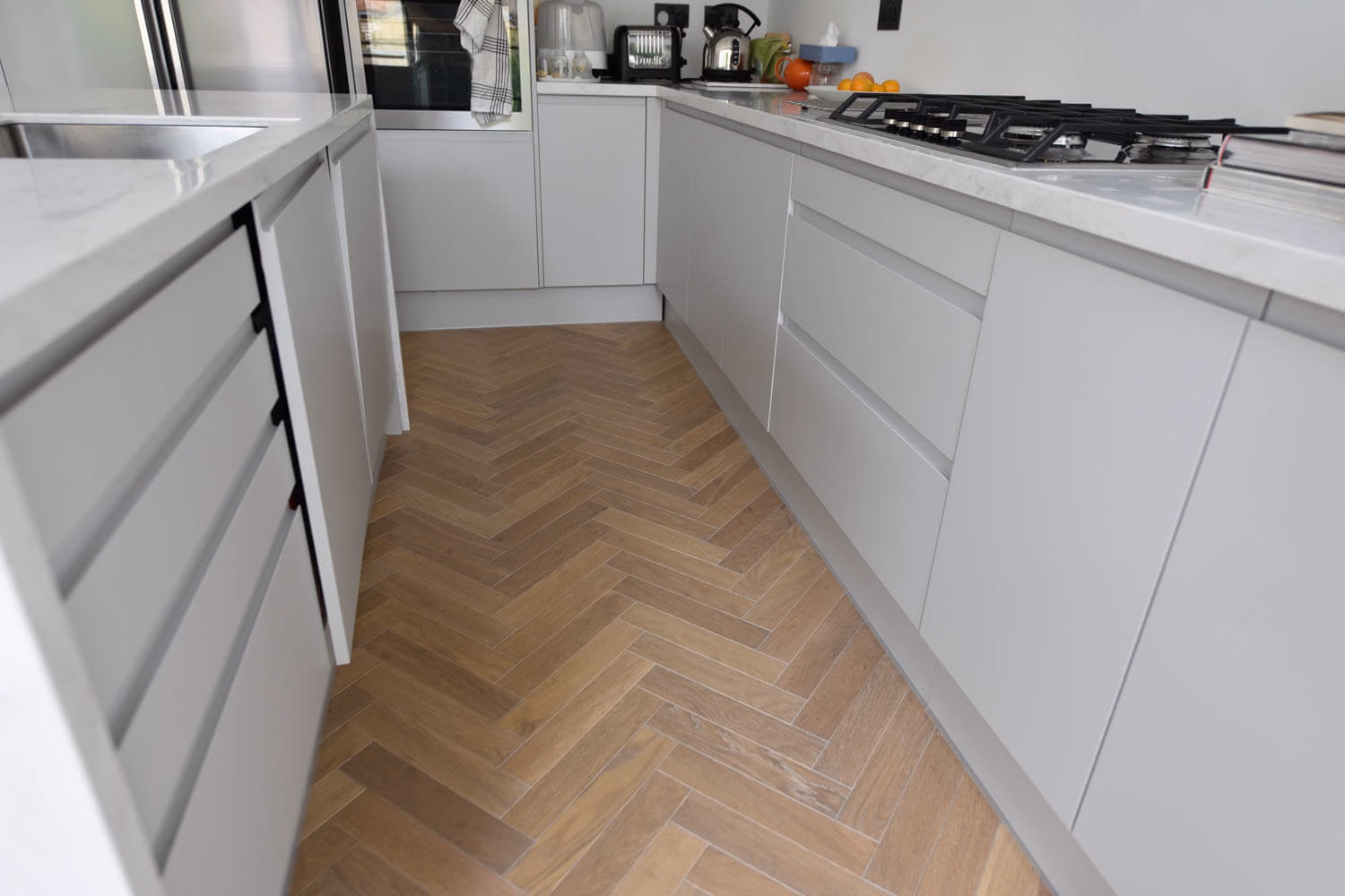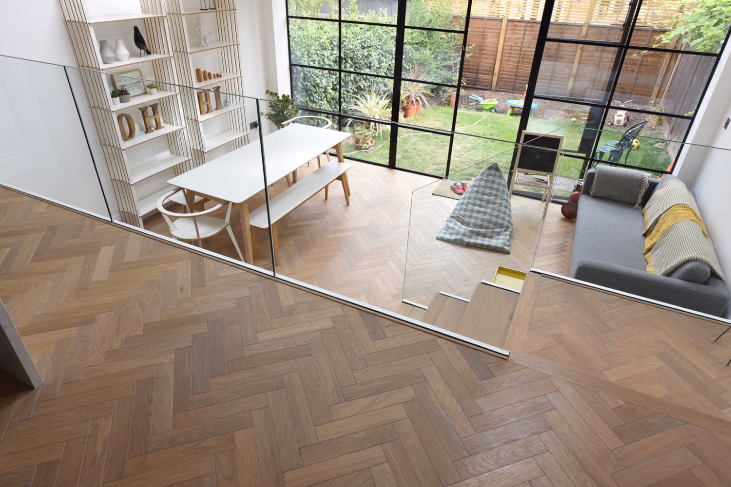 The idea for this project in Ealing, London W13 was to use a small parquet block in keeping with the age of the Victorian property and yet have a contemporary look that would work well with the white kitchen and furniture. The variation of light greys and subtle brown tones works really well against the glass balustrade and the bullnose seamless treads.