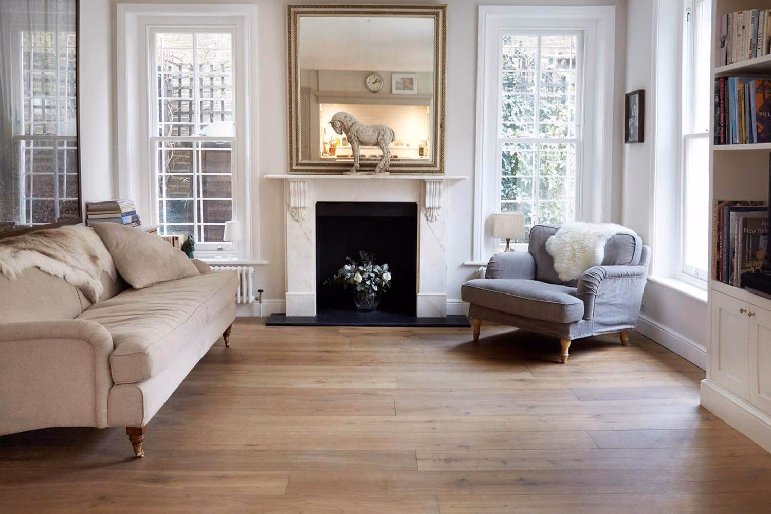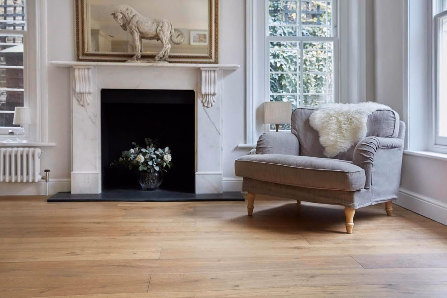 Hammersmith 16mm x 220mm – Character grade Engineered Oak – Our bespoke “Double Fumed” finish compliments this Traditional Victorian House. This space is brighten up by the flooring, original feature fireplaces and sash windows are beautifully contrasted by the warm colour of the fumed natural flooring.