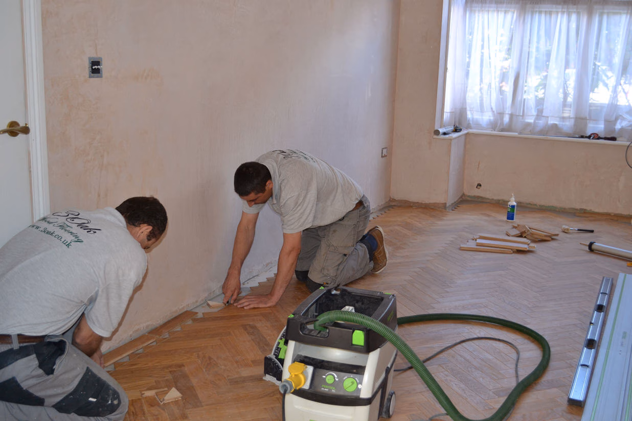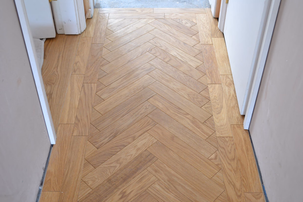 The parquet block size chosen was 21mm x 70mm x 350mm it was also decided to go for a double block border which finished of the herringbone pattern nicely.