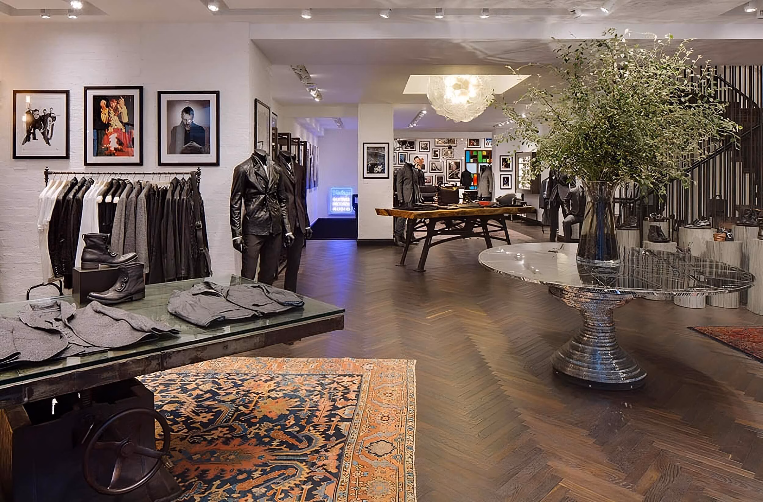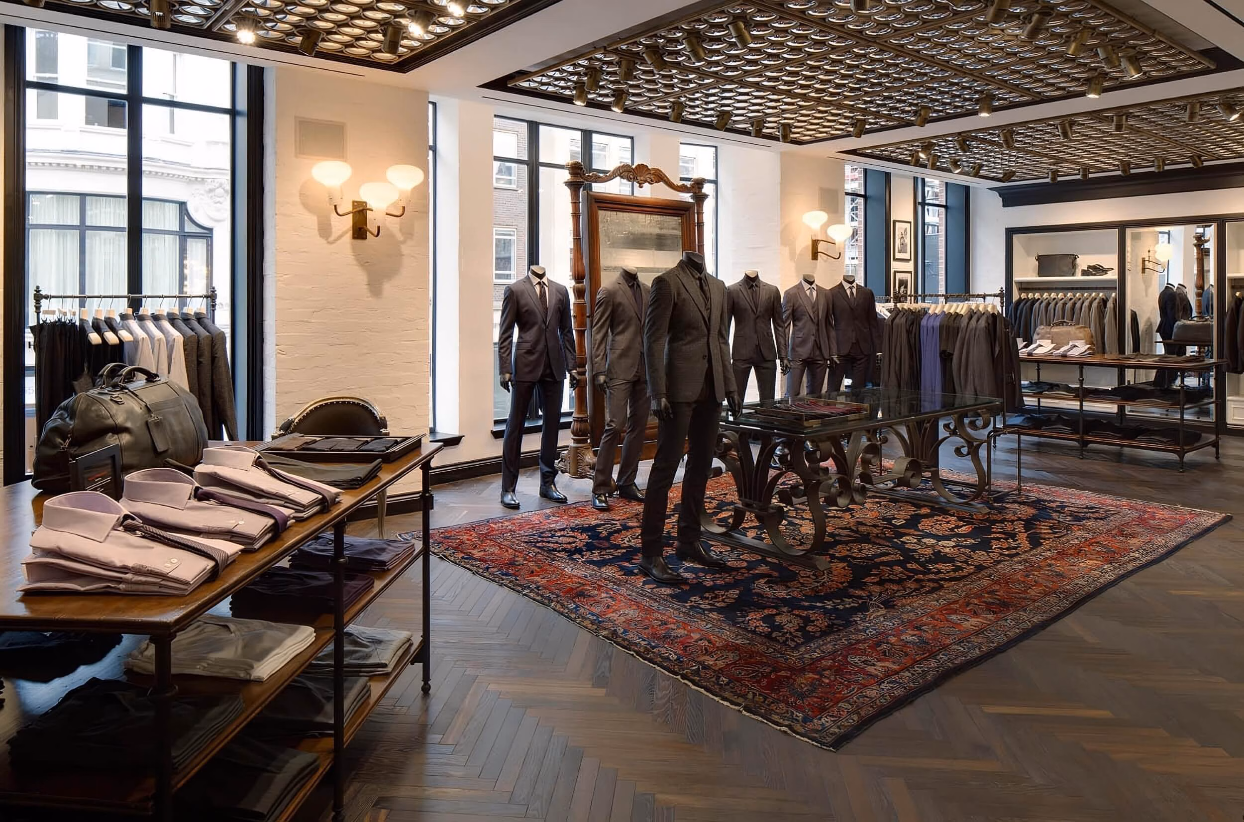 On the ground and 1st floors our American clients specified a Prime grade, herringbone parquet flooring of a narrow width which is a similar size to the parquet in the flagship store in New York. The dimensions specified were 21mm x 60mm x 450mm the boards were smoked for 30 days to create a deep rich chocolate colour all the way through the oak, then a treatment of brushing was used on the wood to create a texture effect then finished off with 3 coats of a satin oil.