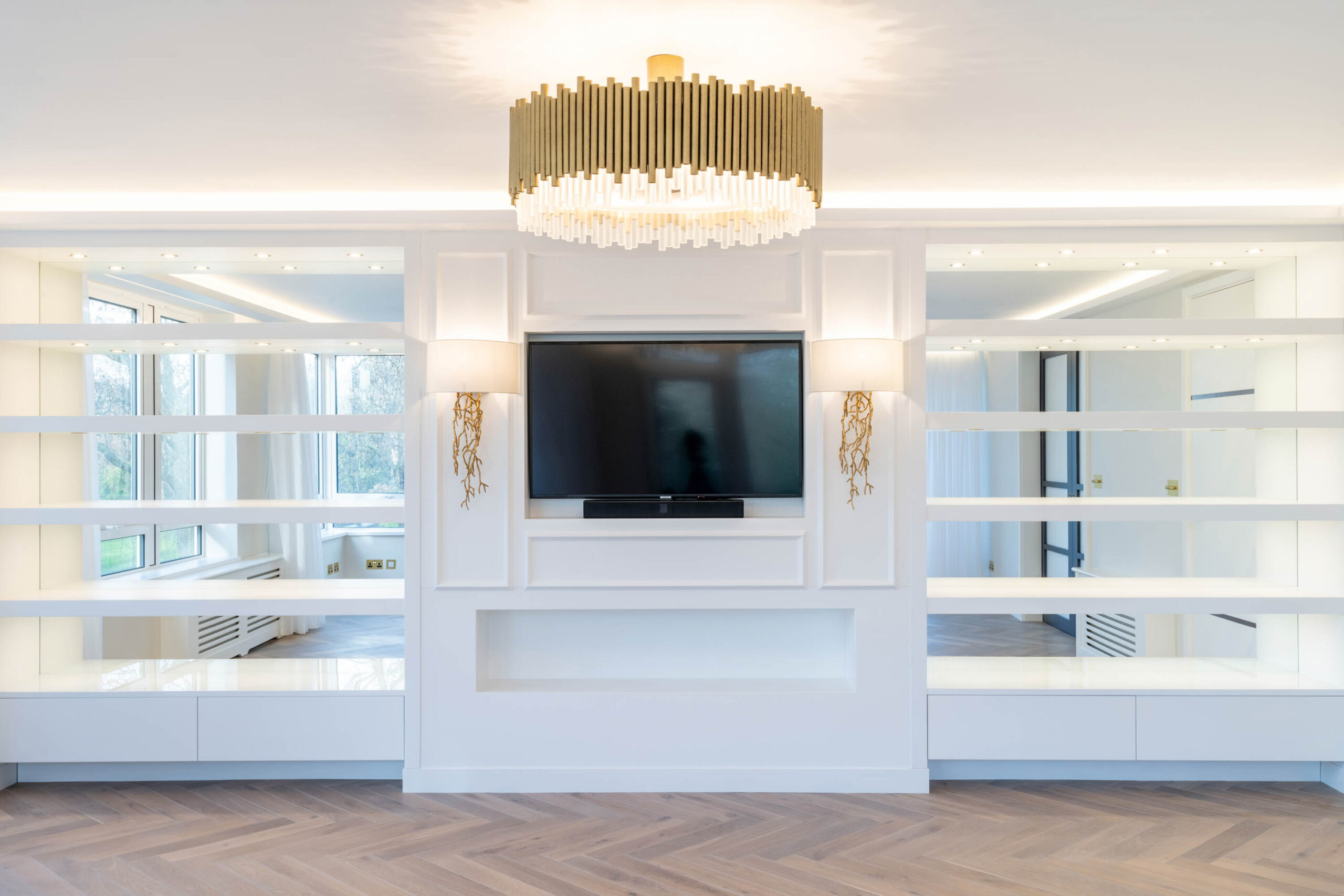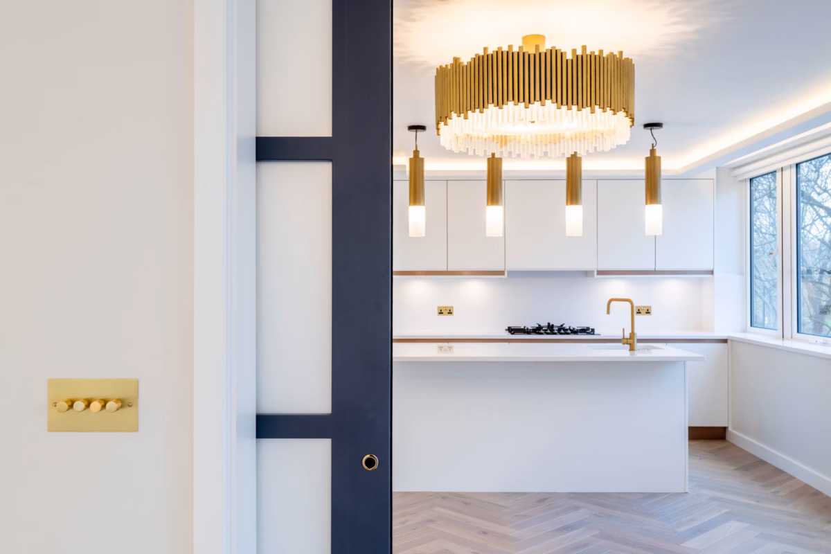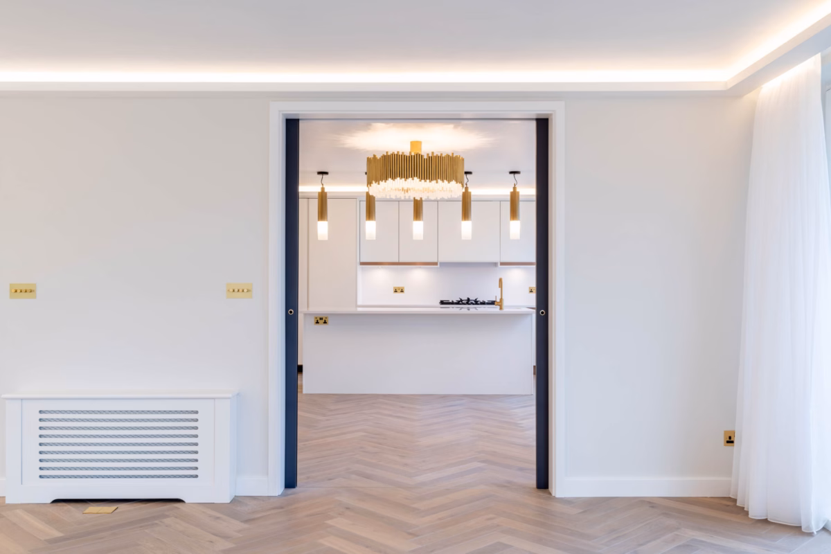 The objective of this project was to elevate the home’s design by installing high-quality herringbone parquet flooring that complements the luxurious yet minimalistic interior. The flooring needed to provide a cohesive and stylish base that harmonizes with gold-accented lighting fixtures, minimalist cabinetry, and glass-panel doors. Additionally, the flooring installation aimed to optimize the layout, seamlessly transitioning across the reception room, kitchen, and hallways while maintaining durability and visual continuity.