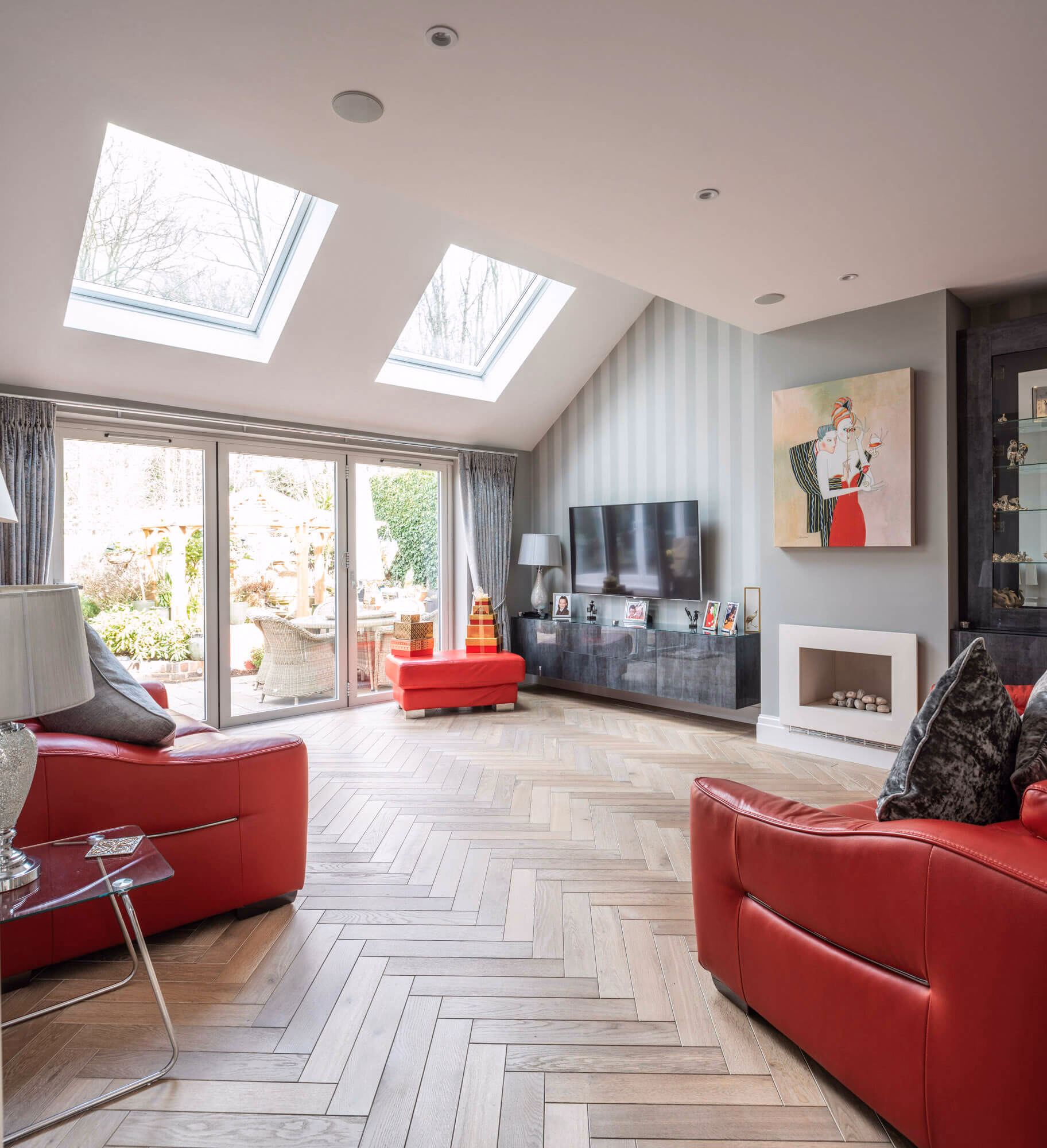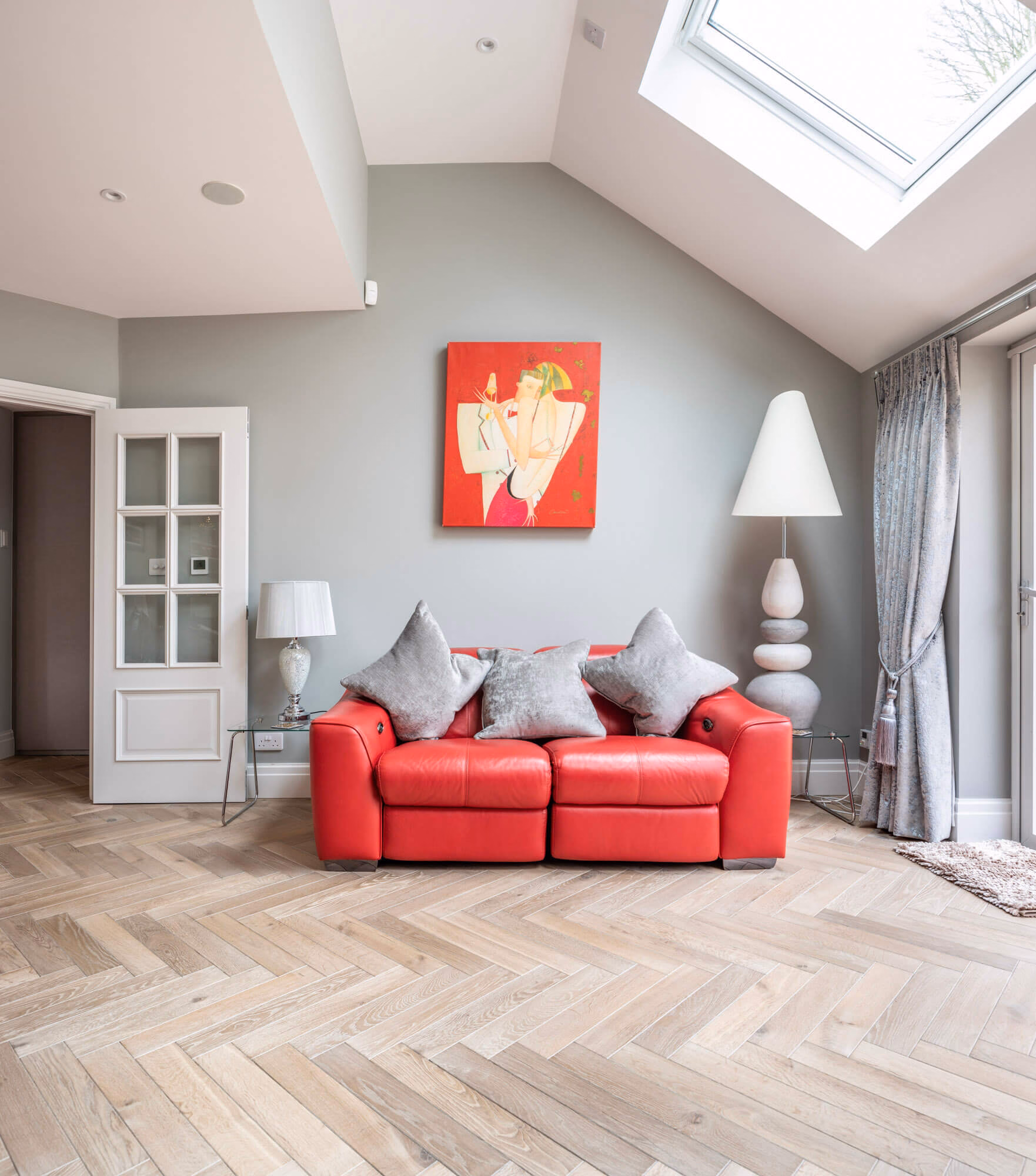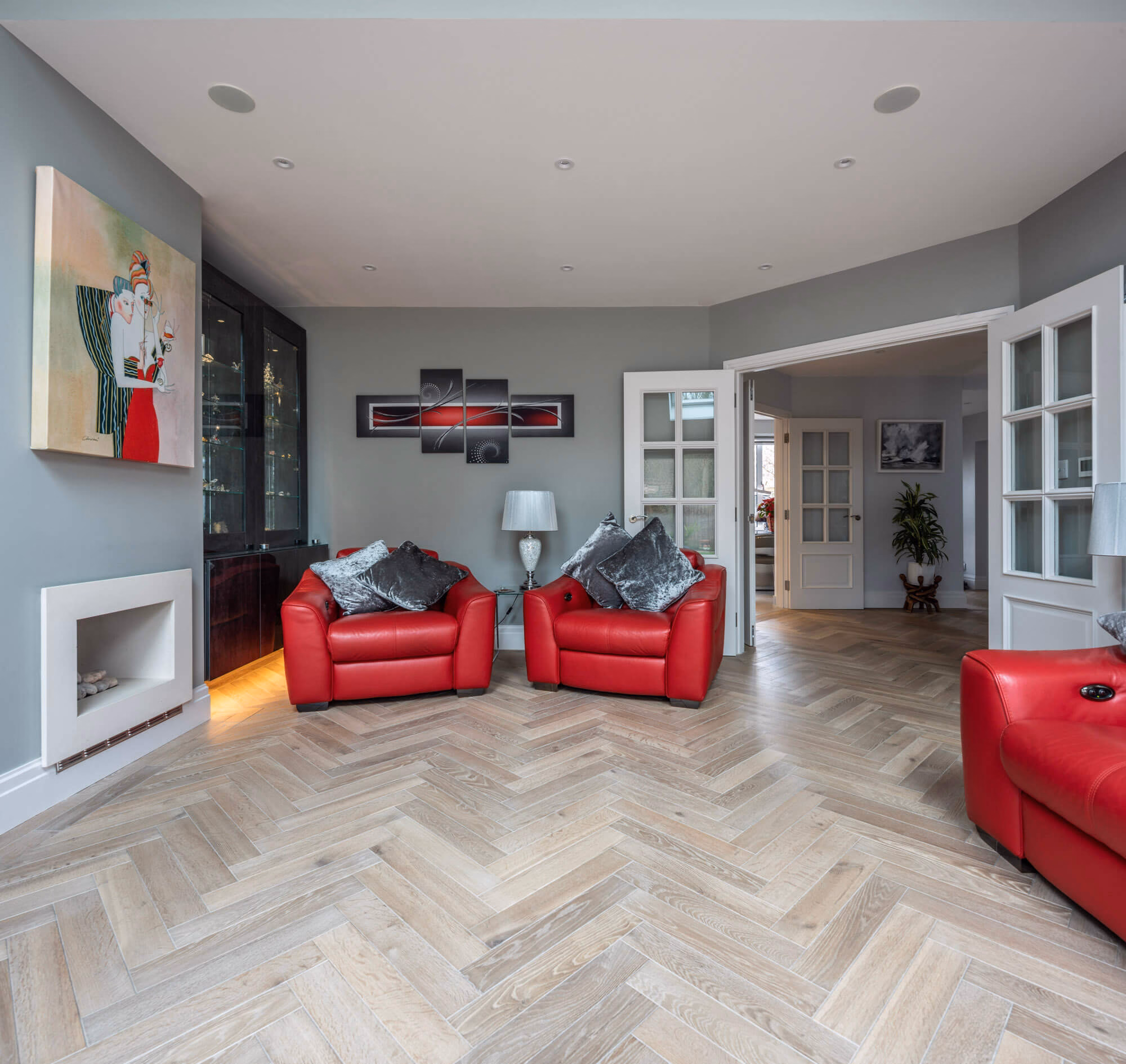 In a home that favours a more minimalist décor, parquet flooring can add a level of depth and complexity without detracting from clean lines and accent pieces. This home in Kingston Upon Thames was well suited to accept a herringbone slate grey parquet that would compliment rather than overwhelm its modestly sized rooms. Installing the same flooring throughout the hallways lends an air of spaciousness that makes the most of oversized doorways. Skylights allow sufficient natural light to pick up on the flooring’s warm tones, which in turn highlights the overall sense of barrier-free living.  As an added touch, the slate grey finish accentuates the stone paving that lies just beyond the floor-to-ceiling glazing, integrating the living room with the adjoining exterior.