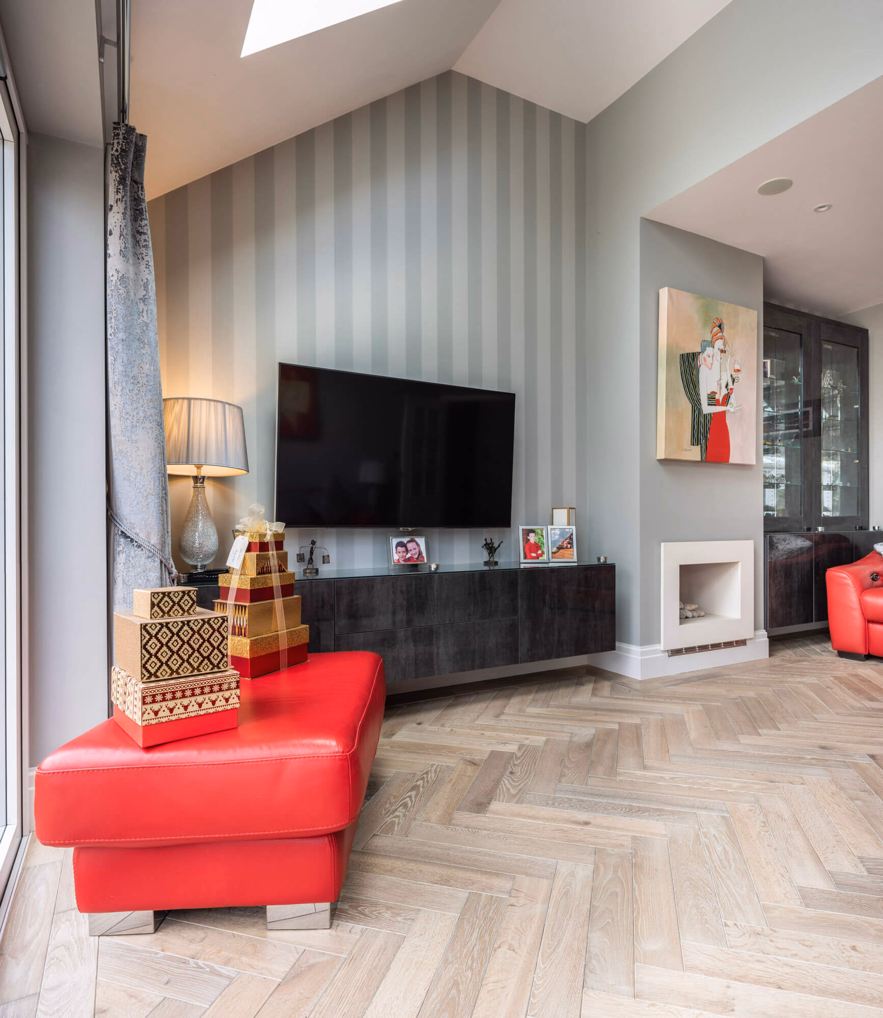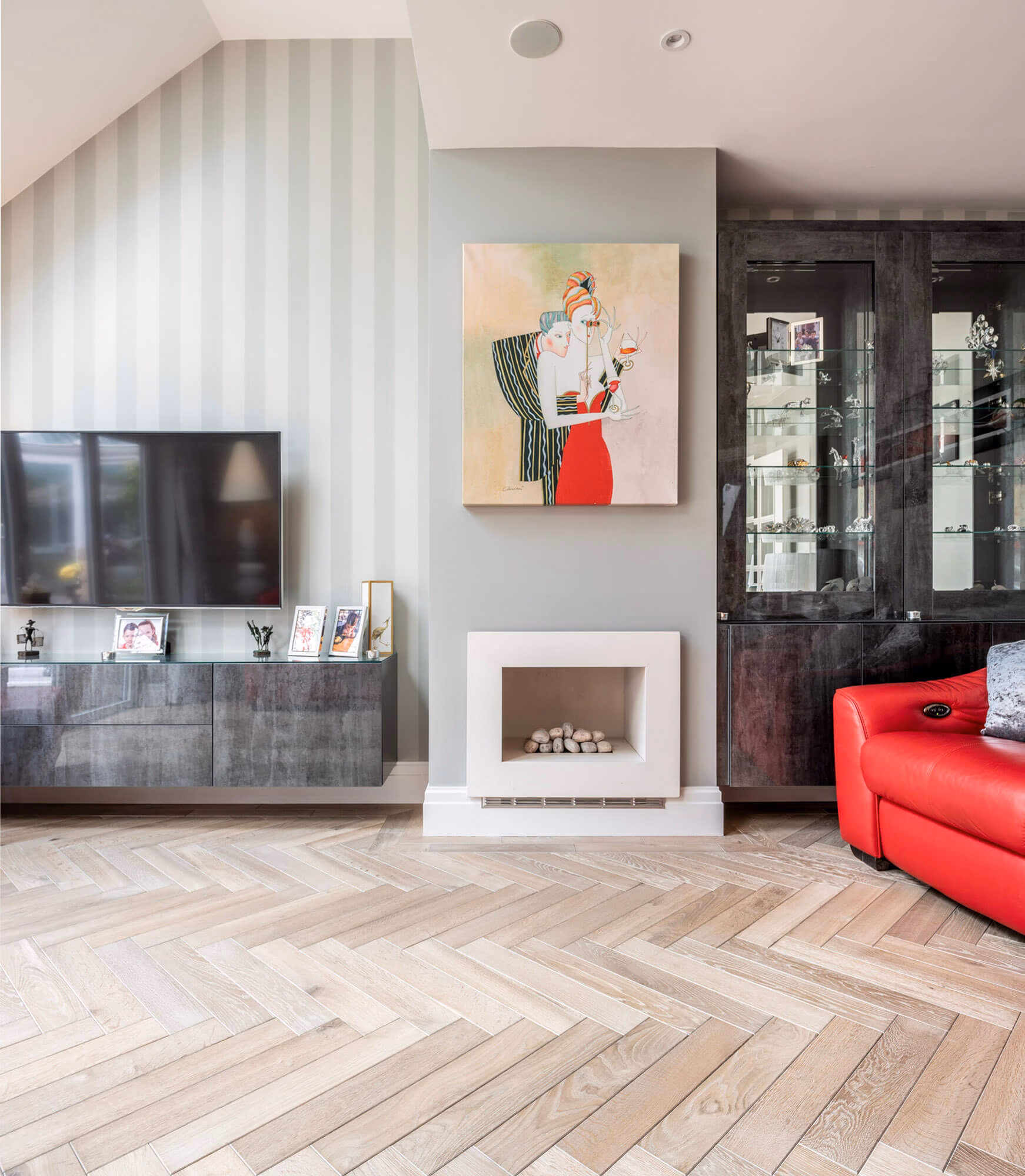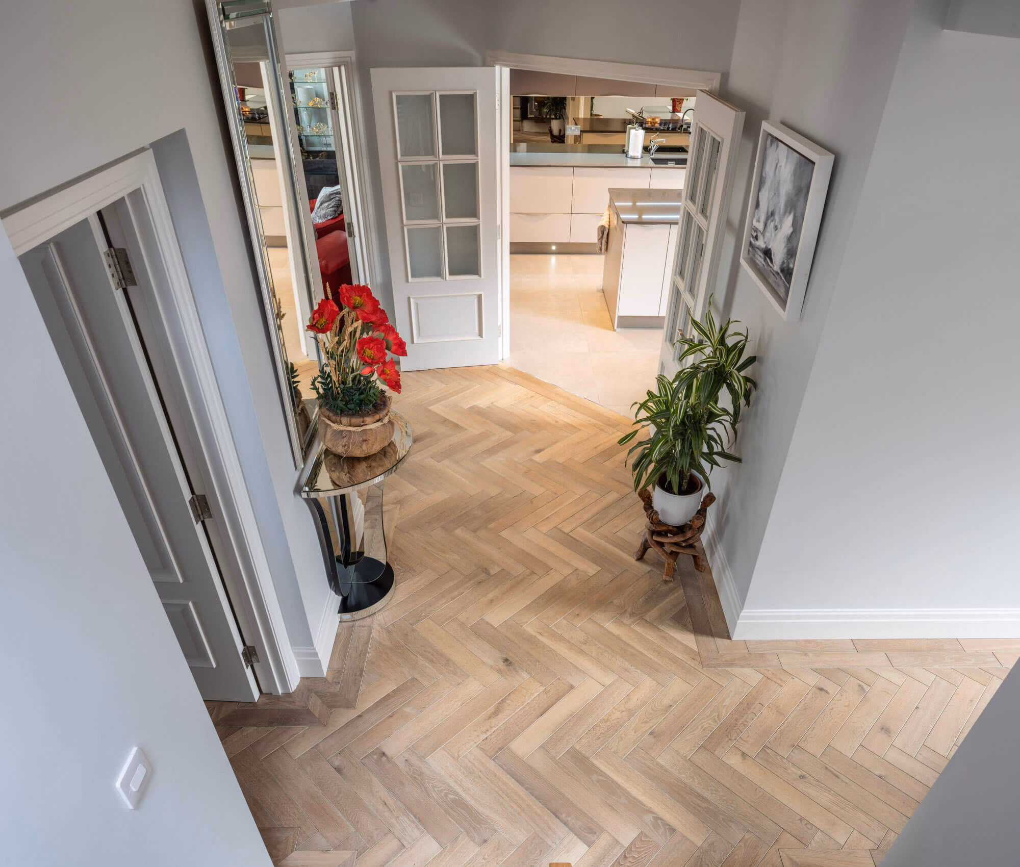 In a home that favours a more minimalist décor, parquet flooring can add a level of depth and complexity without detracting from clean lines and accent pieces. This home in Kingston Upon Thames was well suited to accept a herringbone slate grey parquet that would compliment rather than overwhelm its modestly sized rooms. Installing the same flooring throughout the hallways lends an air of spaciousness that makes the most of oversized doorways. Skylights allow sufficient natural light to pick up on the flooring’s warm tones, which in turn highlights the overall sense of barrier-free living.  As an added touch, the slate grey finish accentuates the stone paving that lies just beyond the floor-to-ceiling glazing, integrating the living room with the adjoining exterior.