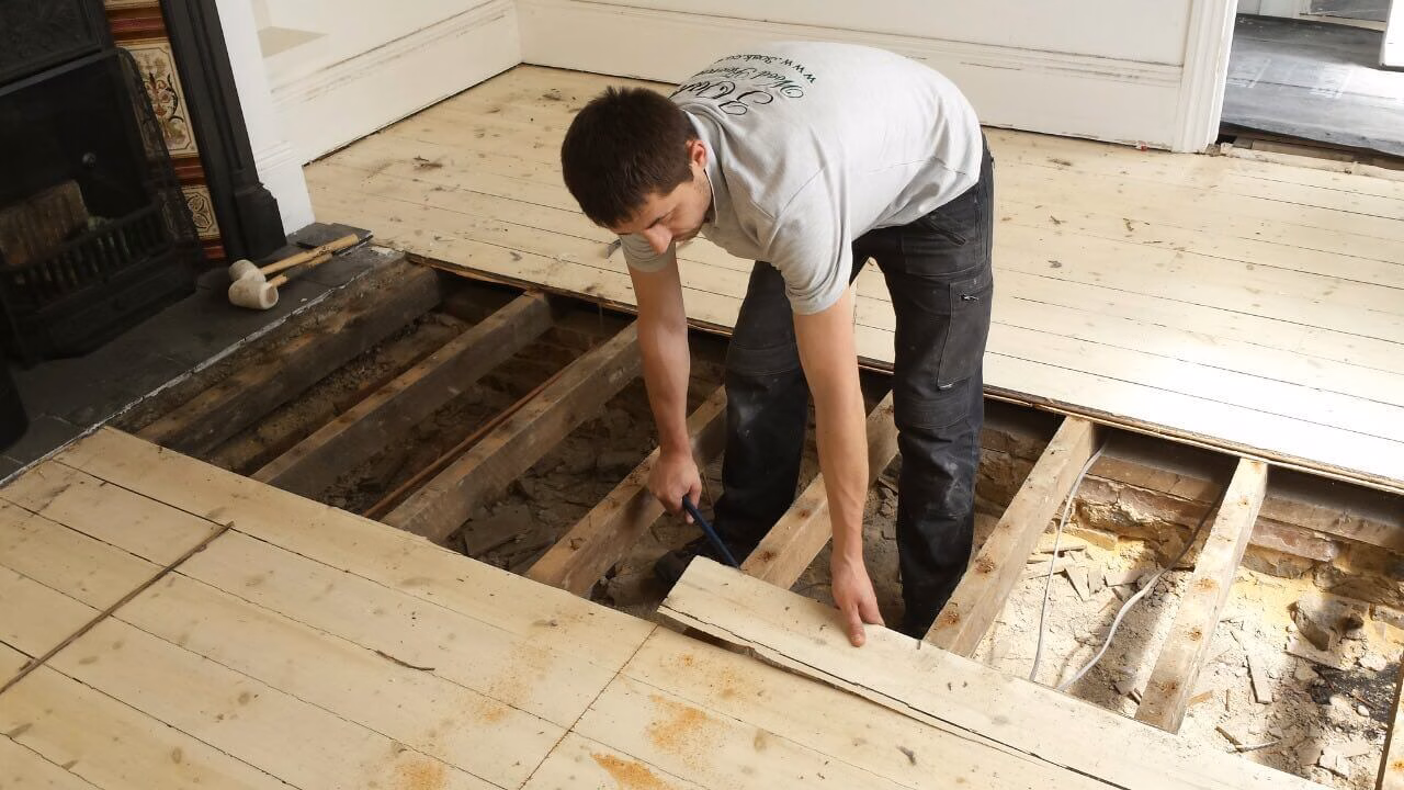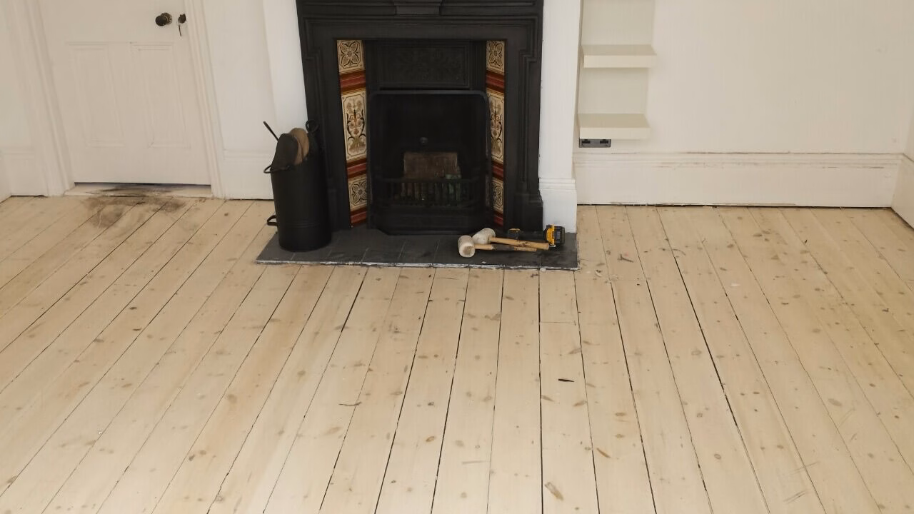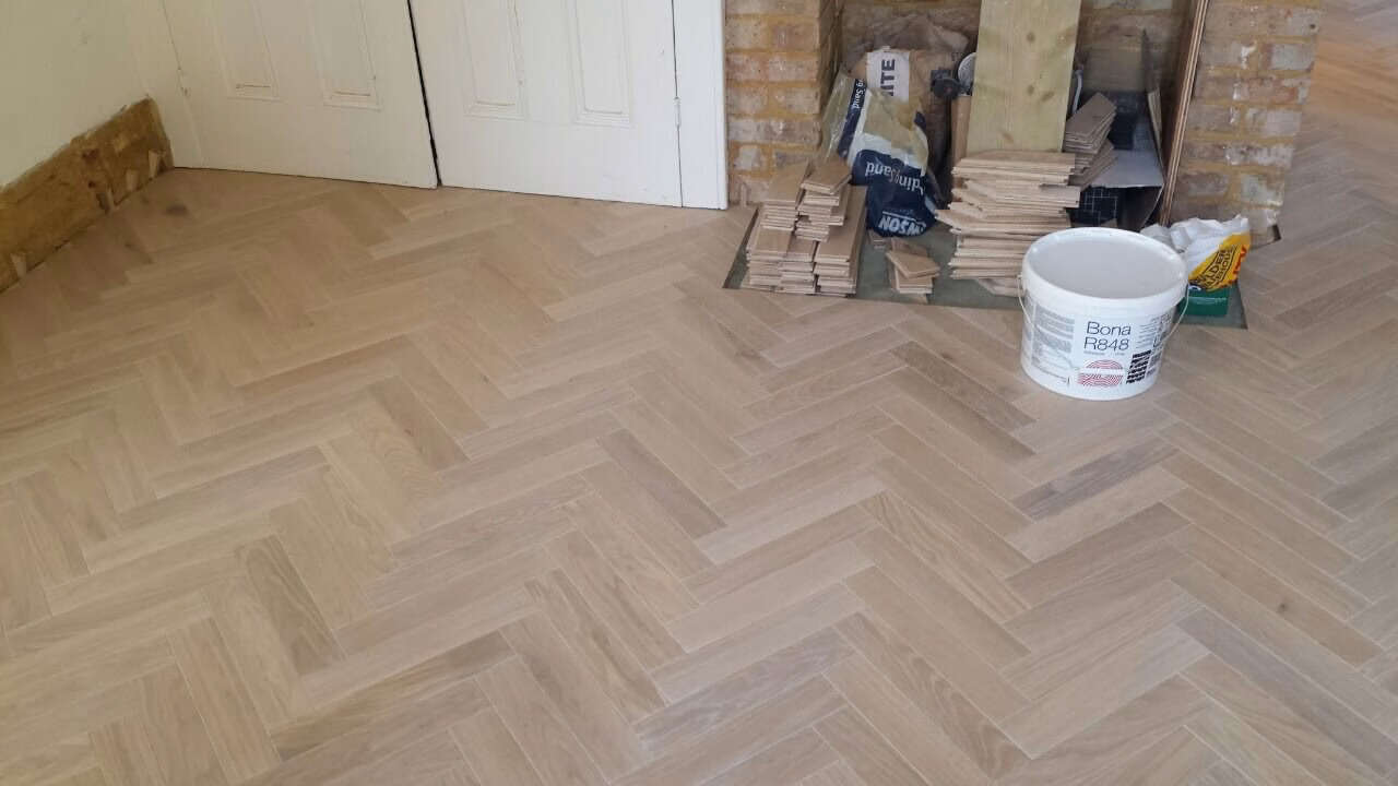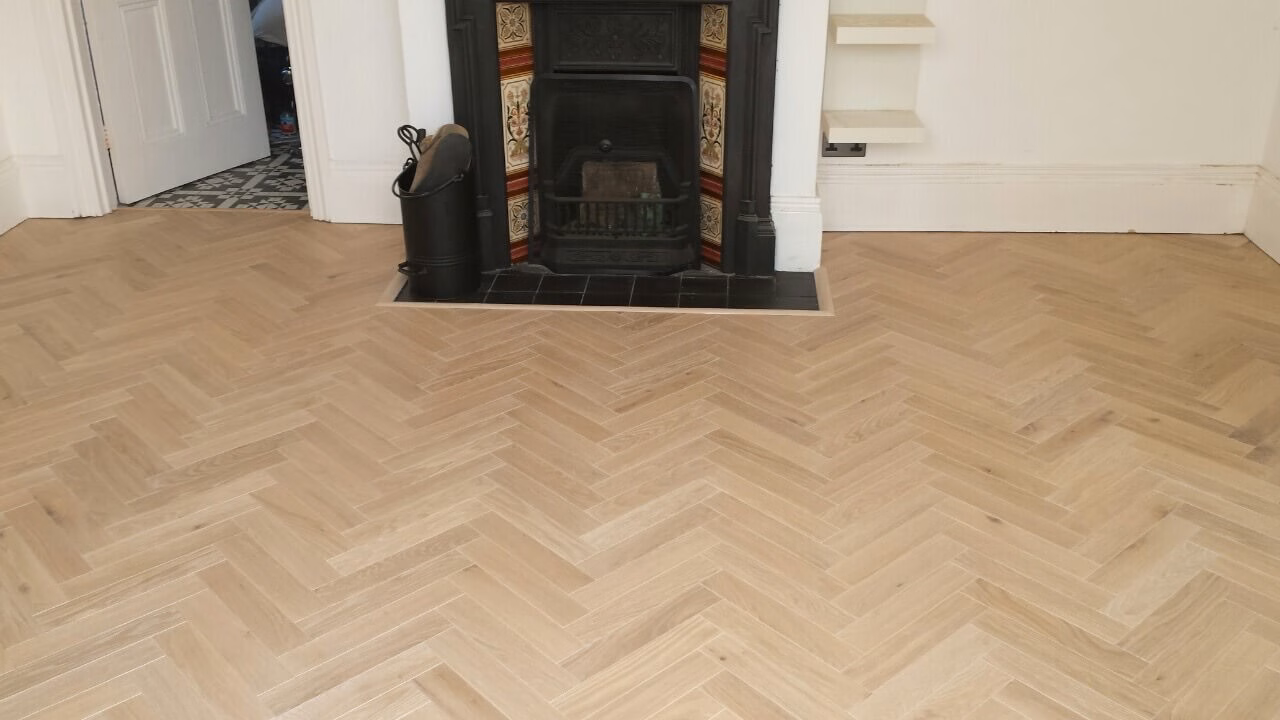 Brushed White in Herringbone Parquet 21mm x 70mm x 350mm Character Grade. This Victorian property required a complete refurbishment of the existing subfloor. Joists have been planed, checked, levelled or replaced where necessary. After a new structural 18mm plywood subfloor was installed, we were able to glue directly on top with the Herringbone Parquet. The original character features in the property are complimented beautifully with the traditional parquet flooring restoring this property to its original splendour.
