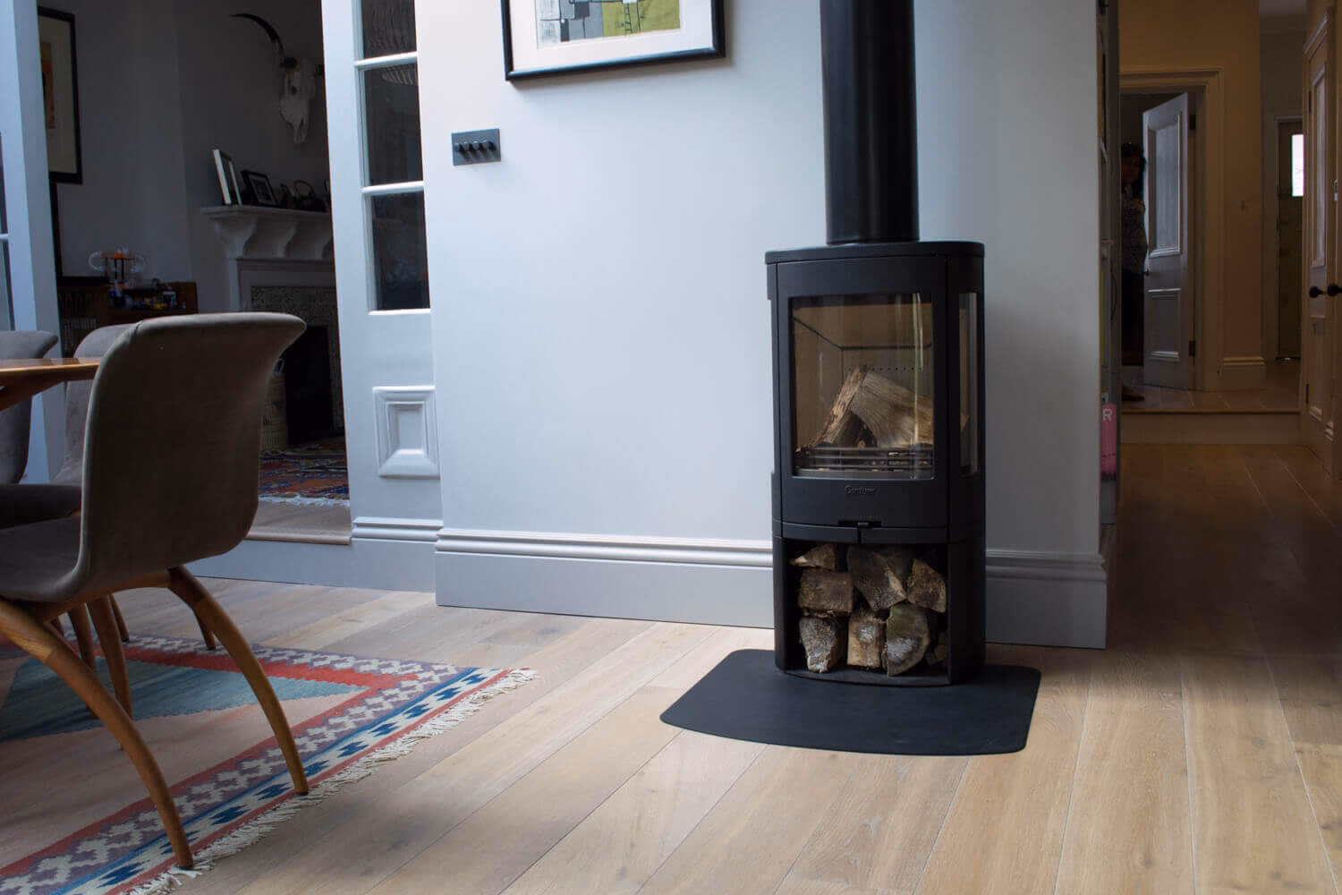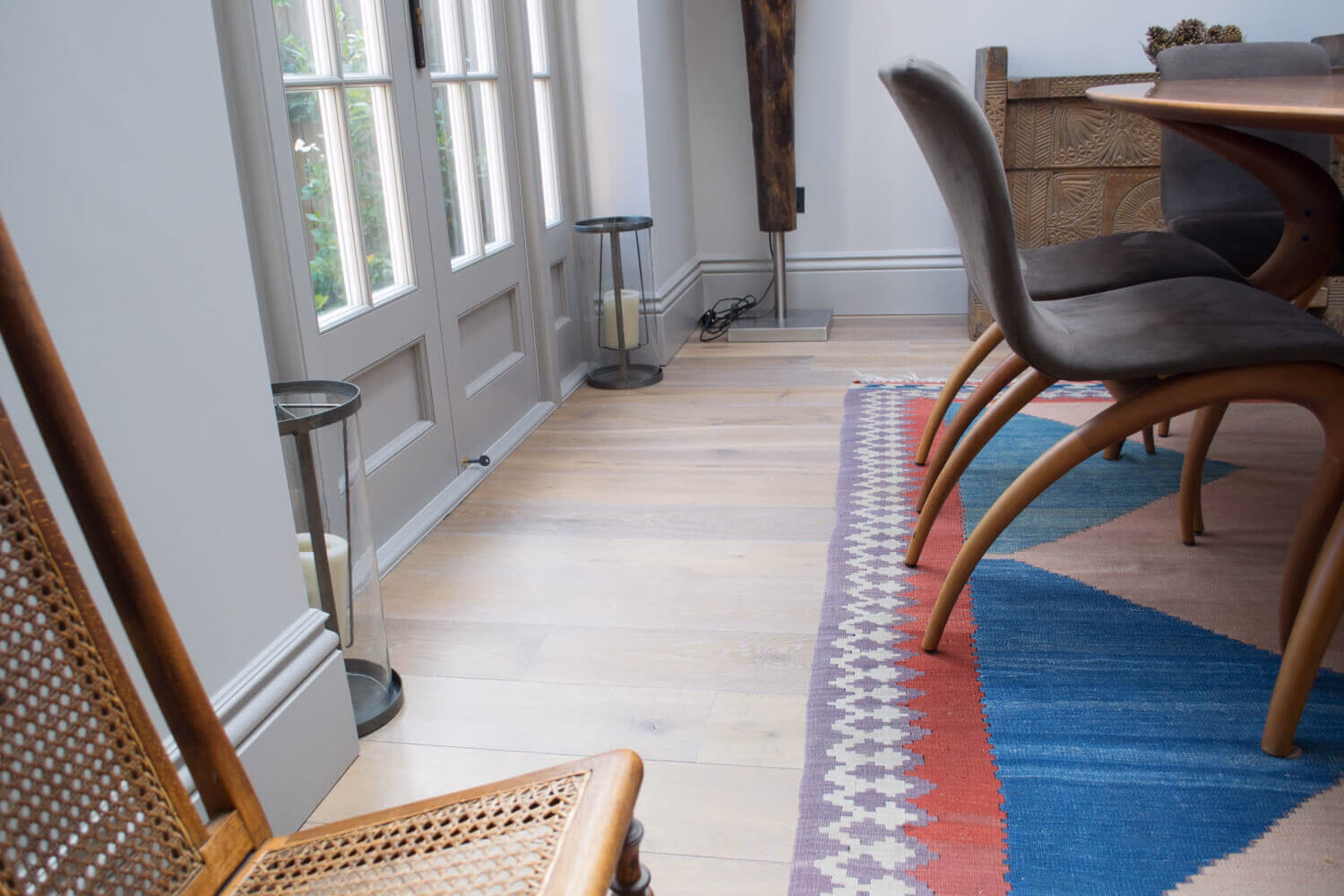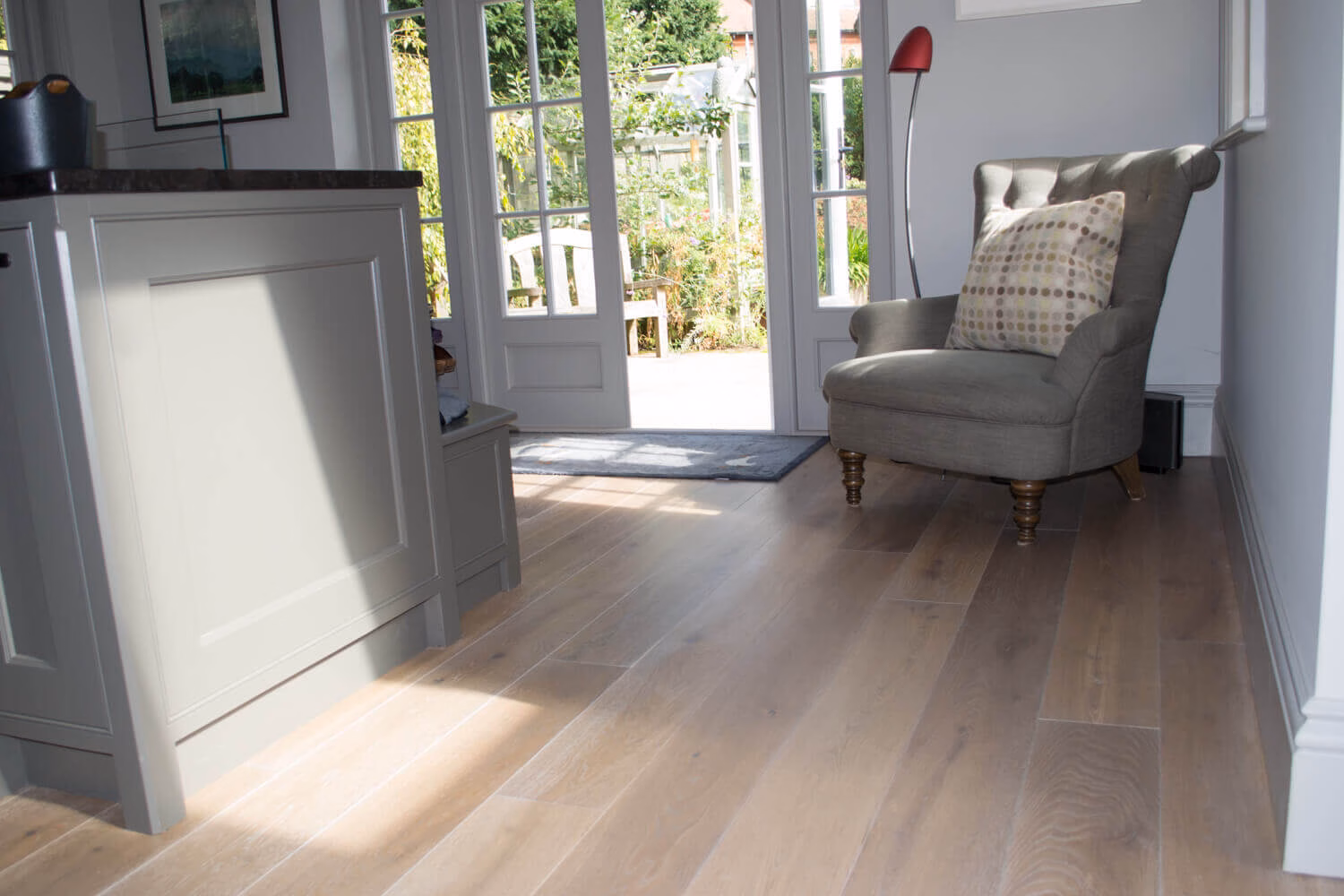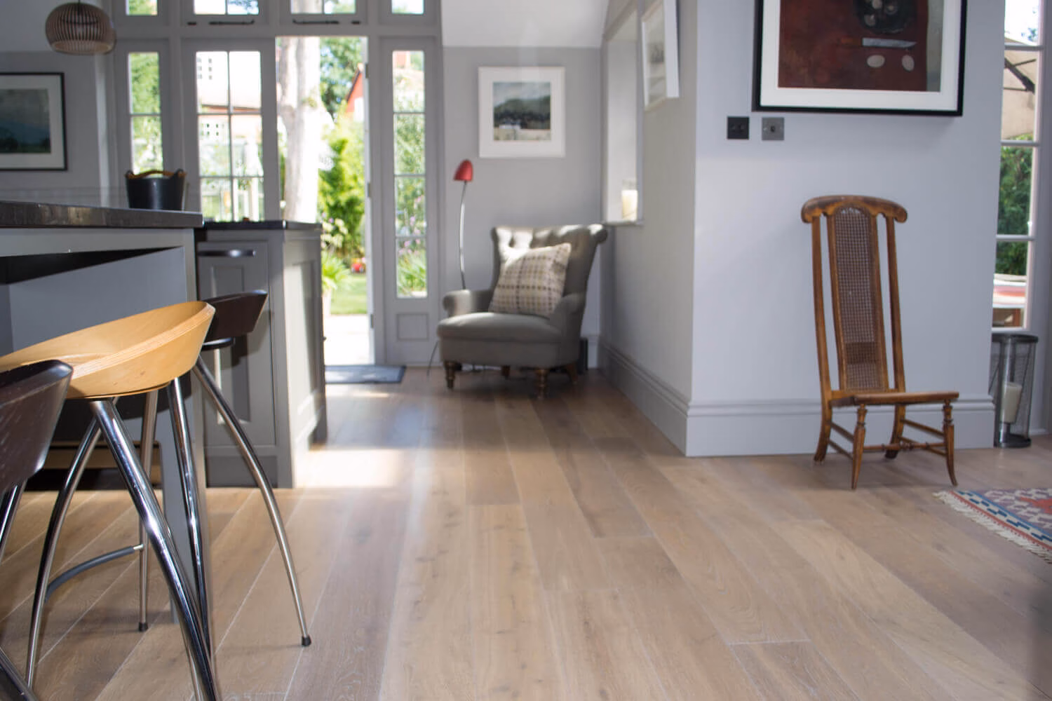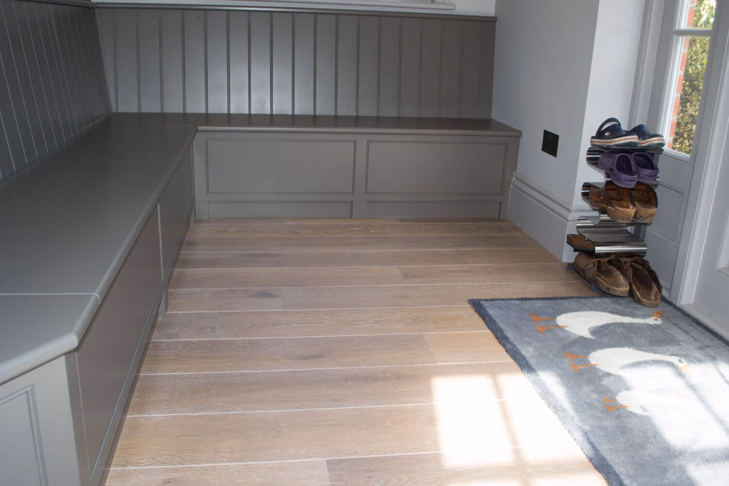 Marlborough Crescent – 21mm x 180mm – Character Grade – Brushed Fumed Bespoke Finish. Engineered Oak is suitable for use with underfloor heating. This bespoke fumed floor has warm notes of Oak with subtle hints of grey that match perfectly with the classic décor. A fantastic result was achieved. The use of Oak flooring with traditional style furniture and neutral colour schemes bring a lot of character and charm to this project.