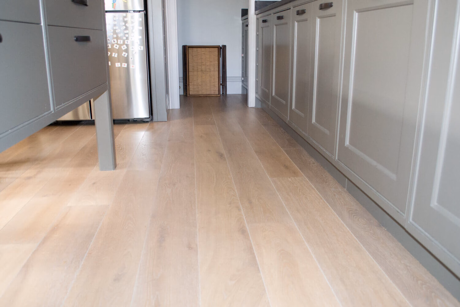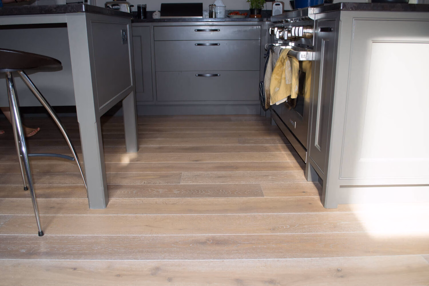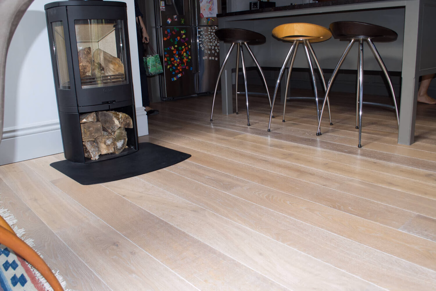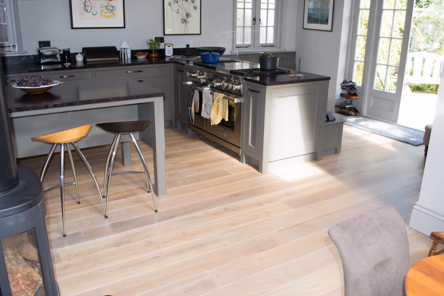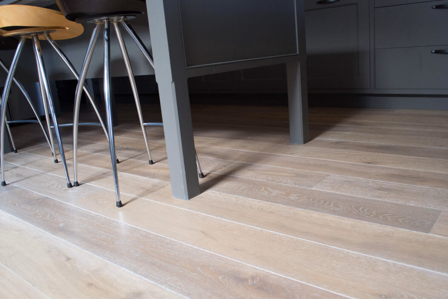 Marlborough Crescent – 21mm x 180mm – Character Grade – Brushed Fumed Bespoke Finish. Engineered Oak is suitable for use with underfloor heating. This bespoke fumed floor has warm notes of Oak with subtle hints of grey that match perfectly with the classic décor. A fantastic result was achieved. The use of Oak flooring with traditional style furniture and neutral colour schemes bring a lot of character and charm to this project.