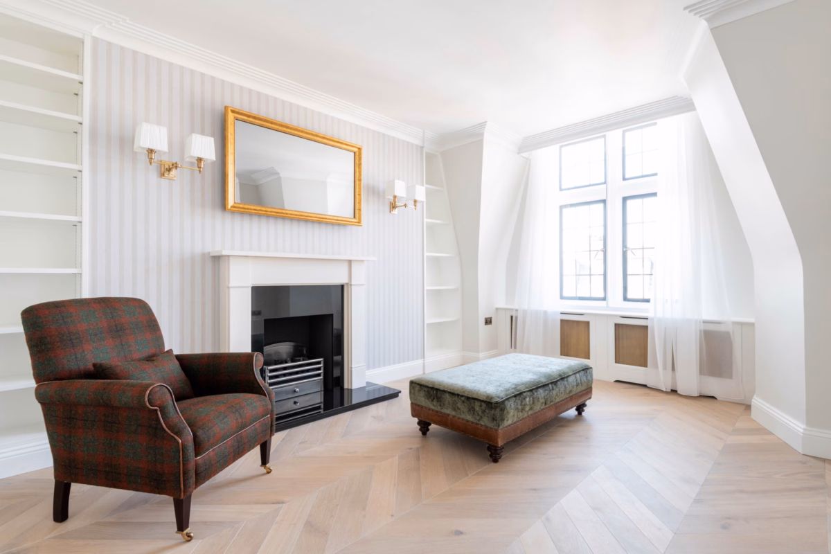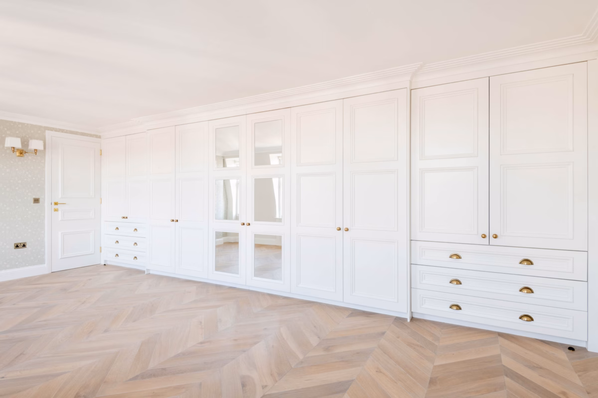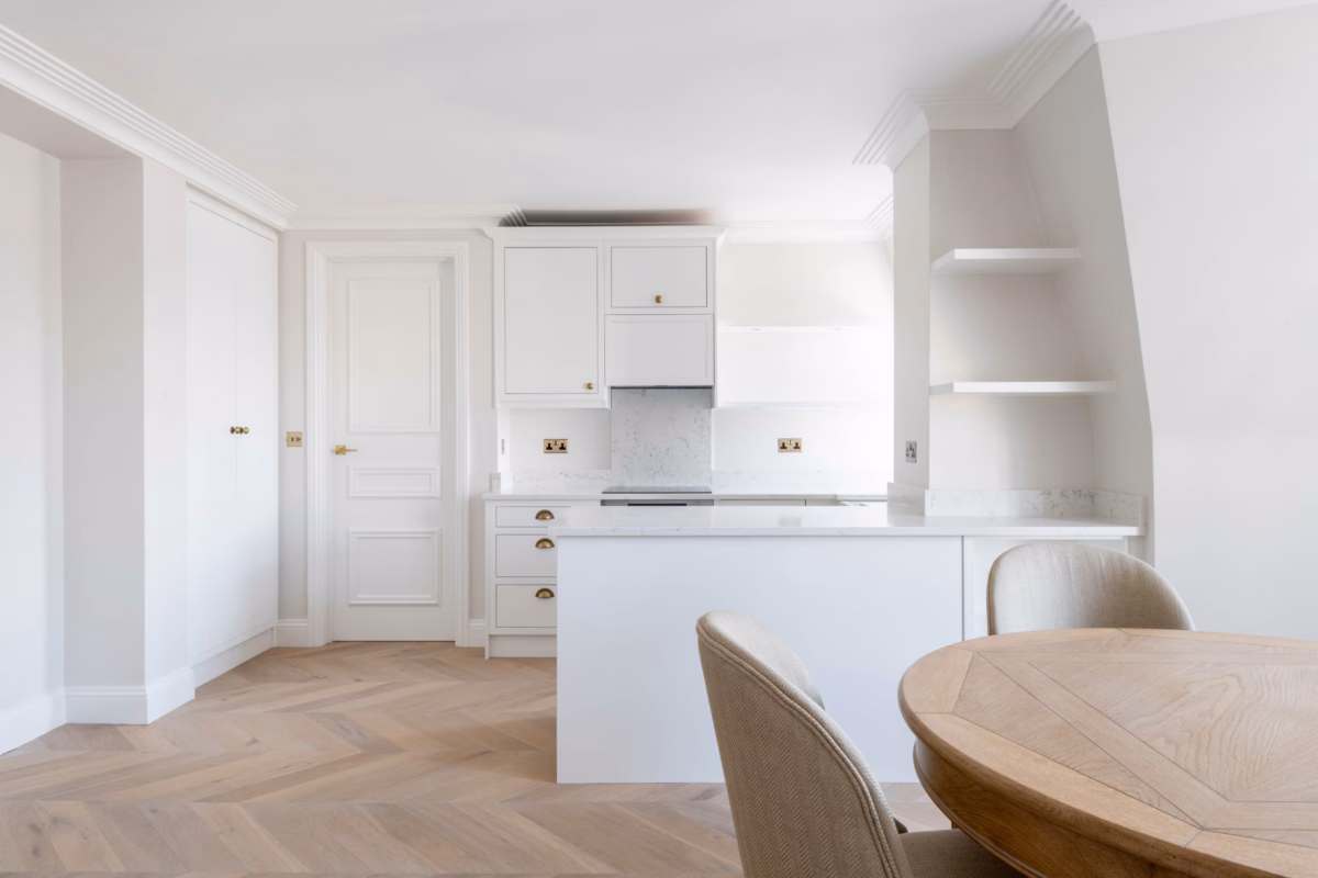 The Grey Smoked Chevron Flooring transformed the residence, unifying the spaces with its timeless design and light, natural tones. The chevron pattern added depth and sophistication to each room, from the living area with its elegant fireplace and symmetrical shelving to the minimalist kitchen and wardrobe spaces. The flooring’s character-grade wood brought warmth and texture, perfectly balancing the classic and contemporary elements of the interior. This project is a testament to how bespoke flooring can enhance a home’s aesthetic and functionality.