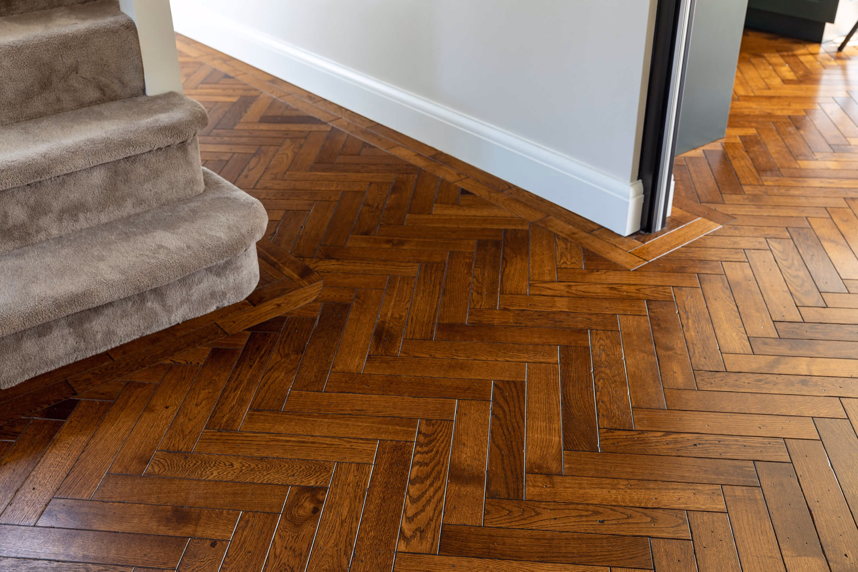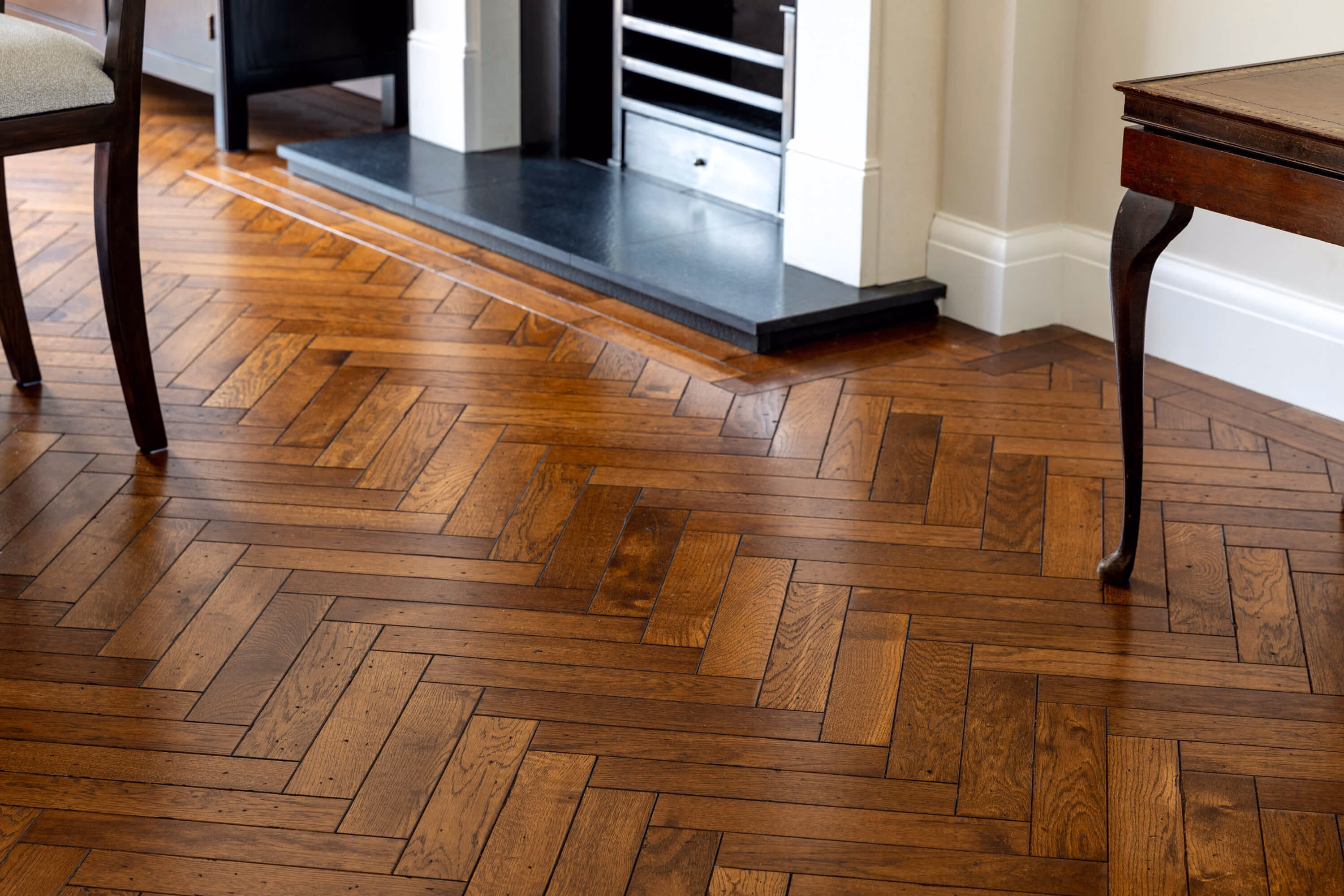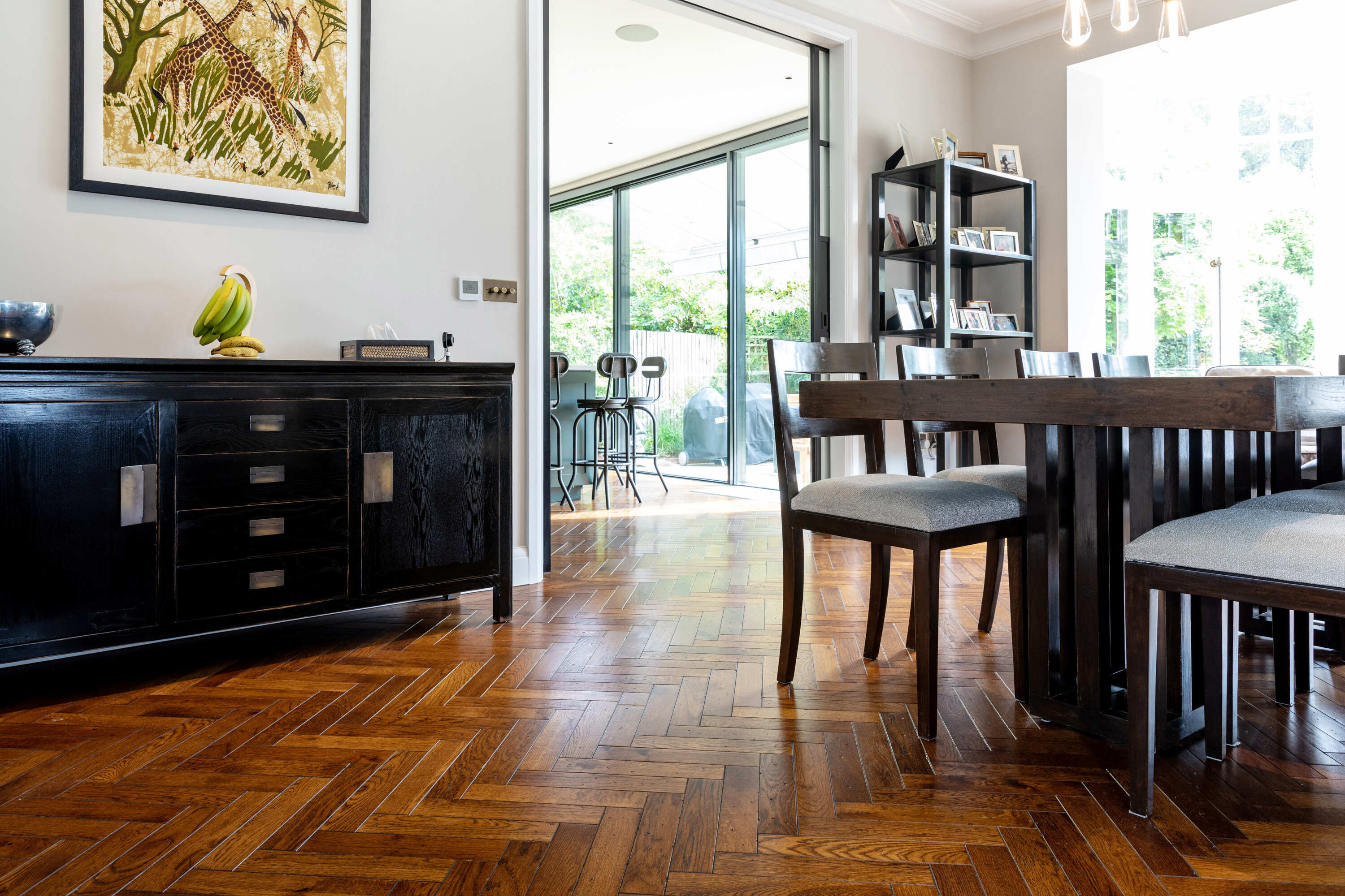 The Park Road Residence in Chiswick, West London, has been transformed with the installation of Old English Fumed Herringbone Flooring, a bespoke distressed flooring solution designed to complement the historical charm of this centuries-old home. The carefully handcrafted floor brings an antiqued aesthetic that enhances the traditional architecture and classic interior design.