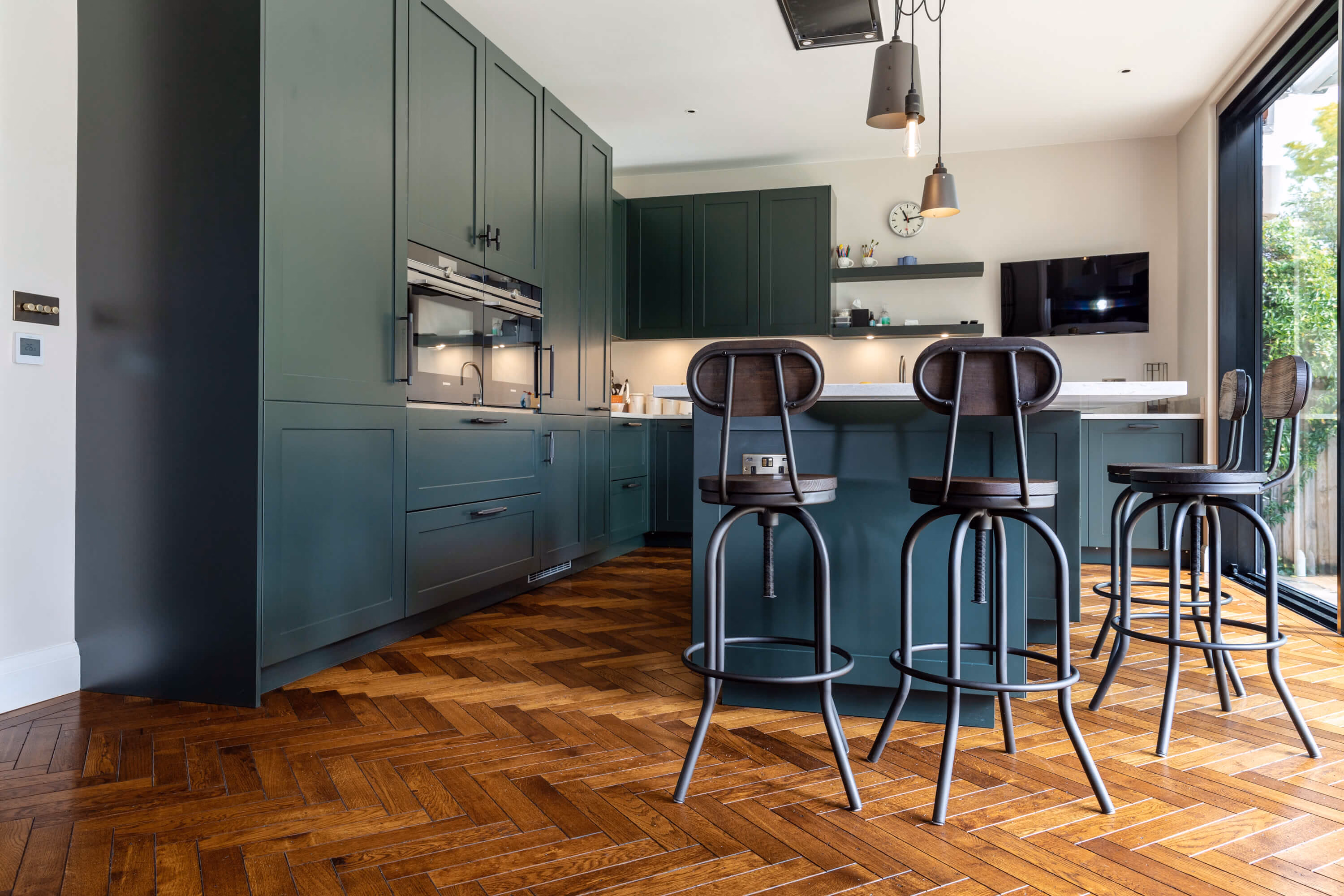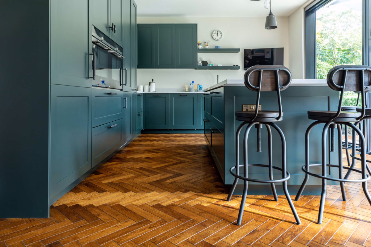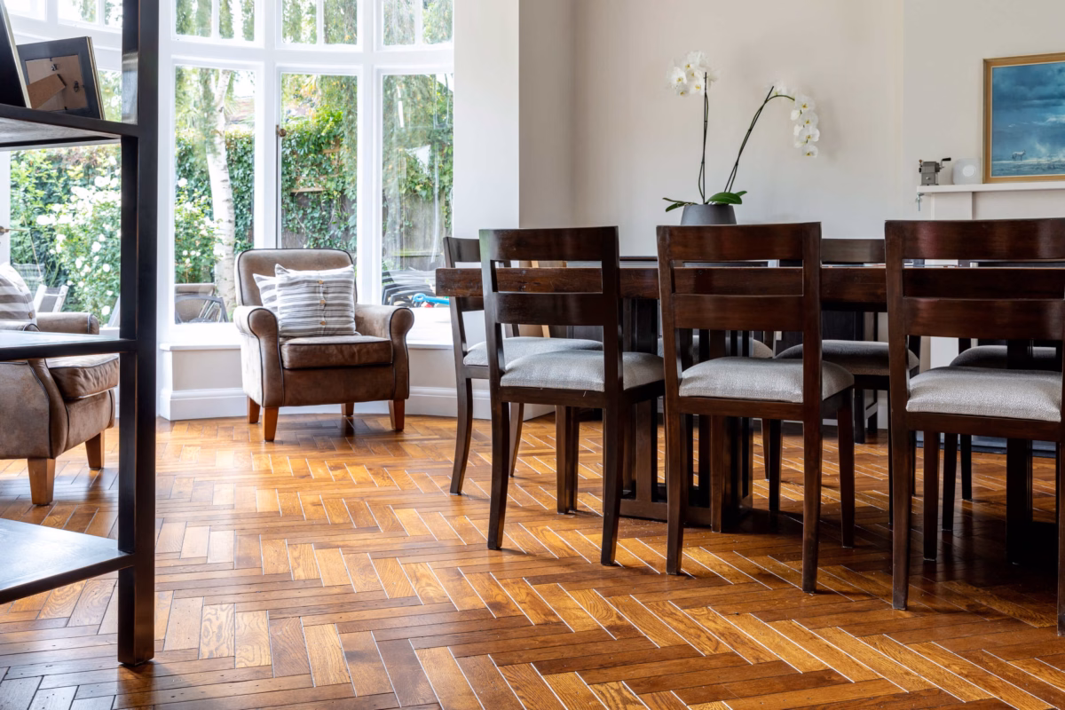 The Park Road Residence in Chiswick, West London, has been transformed with the installation of Old English Fumed Herringbone Flooring, a bespoke distressed flooring solution designed to complement the historical charm of this centuries-old home. The carefully handcrafted floor brings an antiqued aesthetic that enhances the traditional architecture and classic interior design.