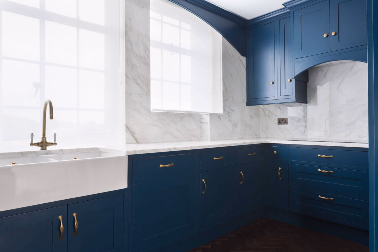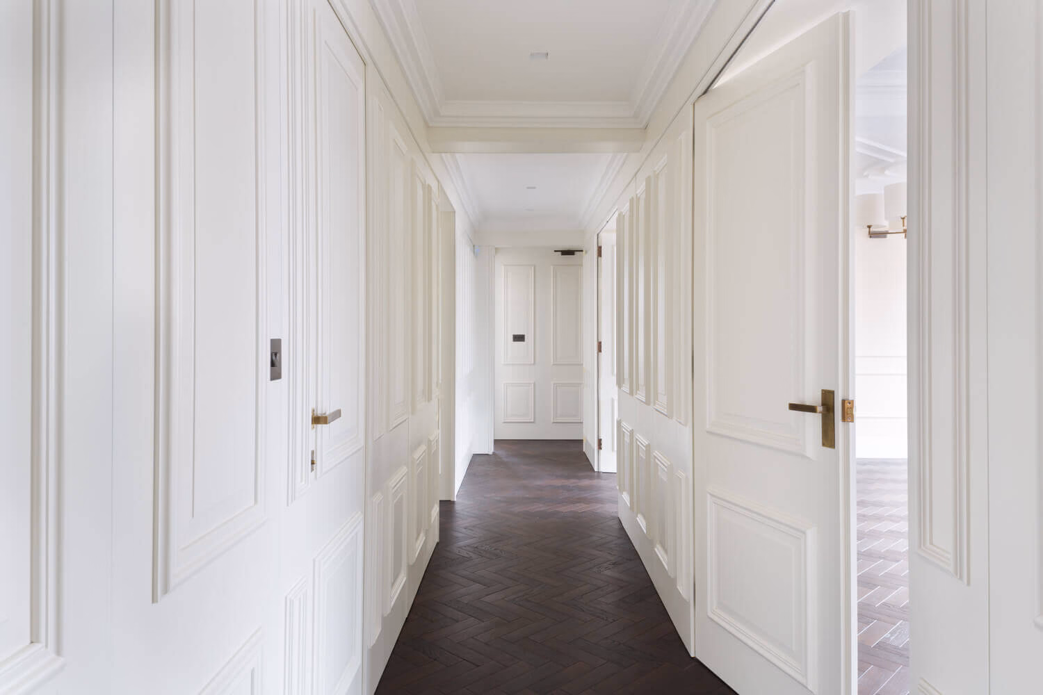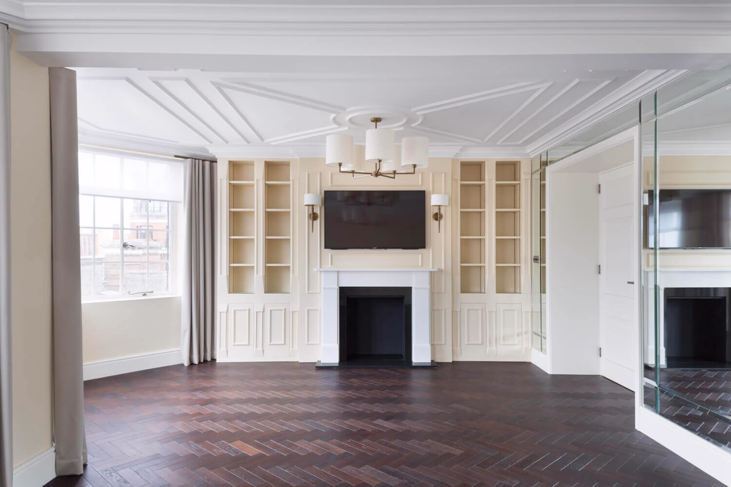 30 Day Fumed Engineered Oak in Herringbone Prime Grade – Dimensions: 21mm x 80mm x 300mm. This traditional “Victorian” sized Parquet is a perfect fit for this 19th century period property in Central London. The dark parquet is beautifully contrast with the white walls. This works elegantly with the stylish design and original features.